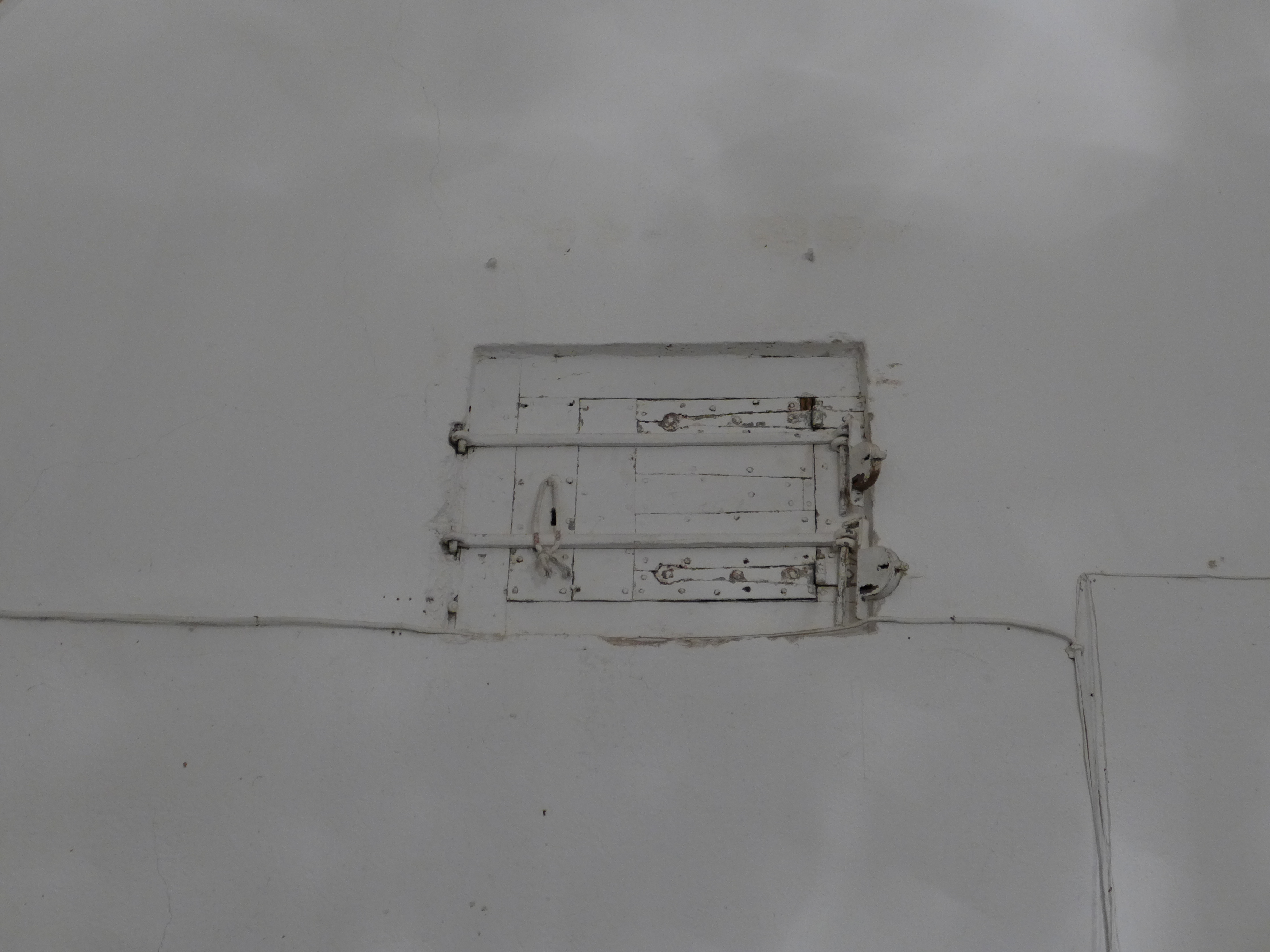 Consta de marco y puerta compuesta de cinco tablillas verticales. Tiene triple cierre a base de una cerradura en la puerta y dos bisagras con sus respectivas cerrajas y candados.