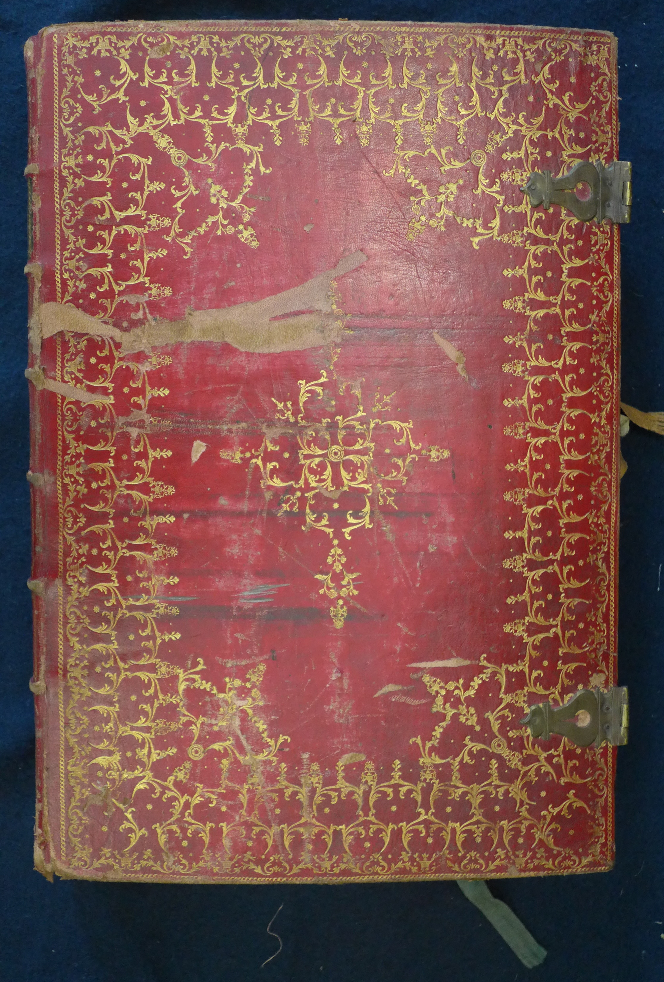 Encuadernado en cuero con gofrado con pan de oro y cierres metálicos.