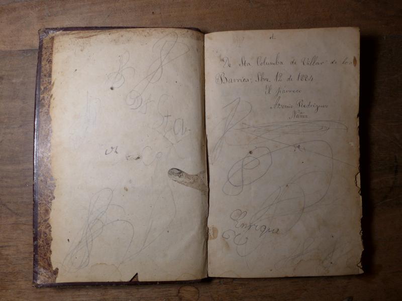 Inscripción en la primera página en blanco: "De Sta Columba de Villar de los Barrios: Sbre. 12 de 1884. El párroco. Arsenio Rodríguez Núñez