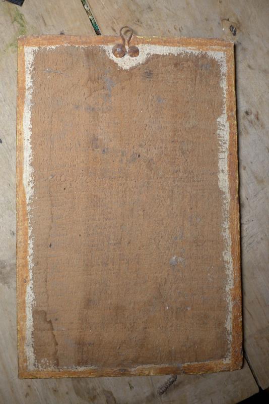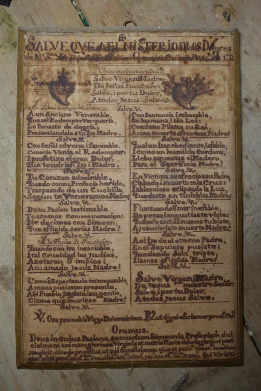 Tablilla de madera de forma rectangular. Su contorno, abocelado, va pintado de dorado, mientras la parte central se cubre por completo con un pape en el que se manuscribió la inscripción correspondiente y que parece haberse compuesto en distintos momentos. La principal dice: SALVE QUE A EL MISTERIO DE LOS Dolores de Mª. Sma. impuso Dn. Manuel González Carbajo, Presbítero. Año 1773