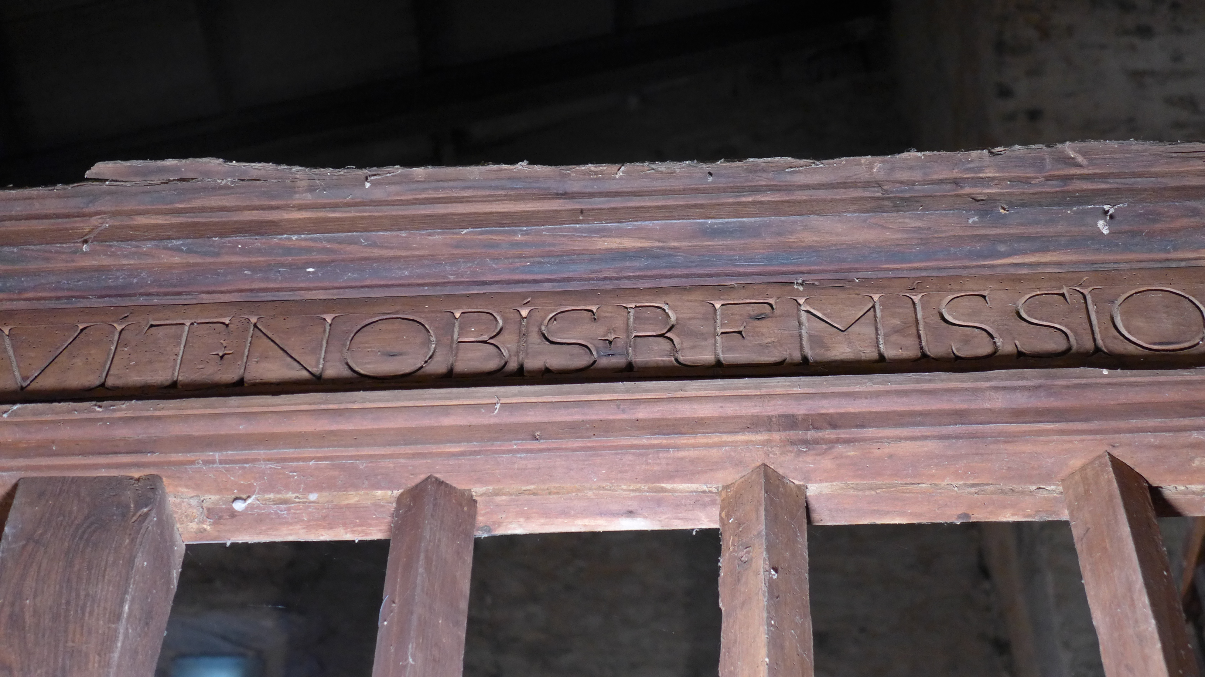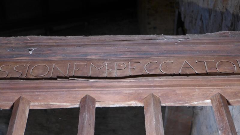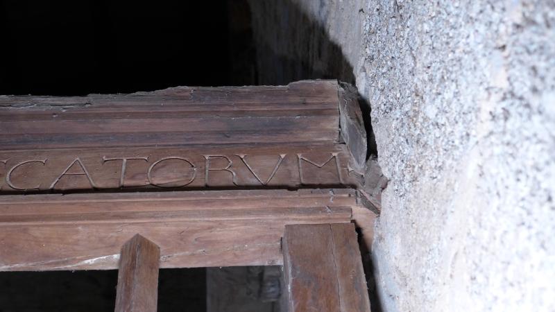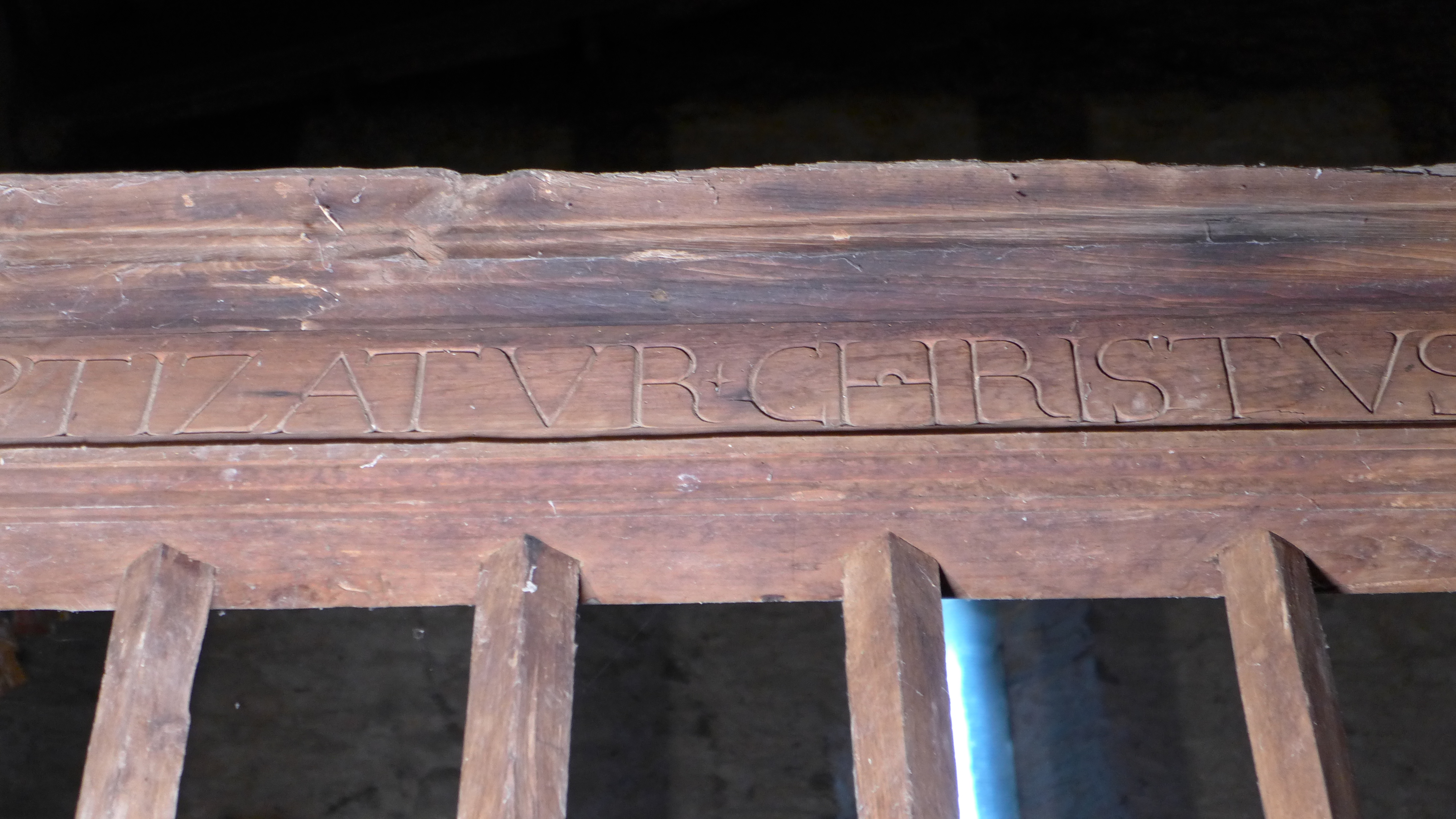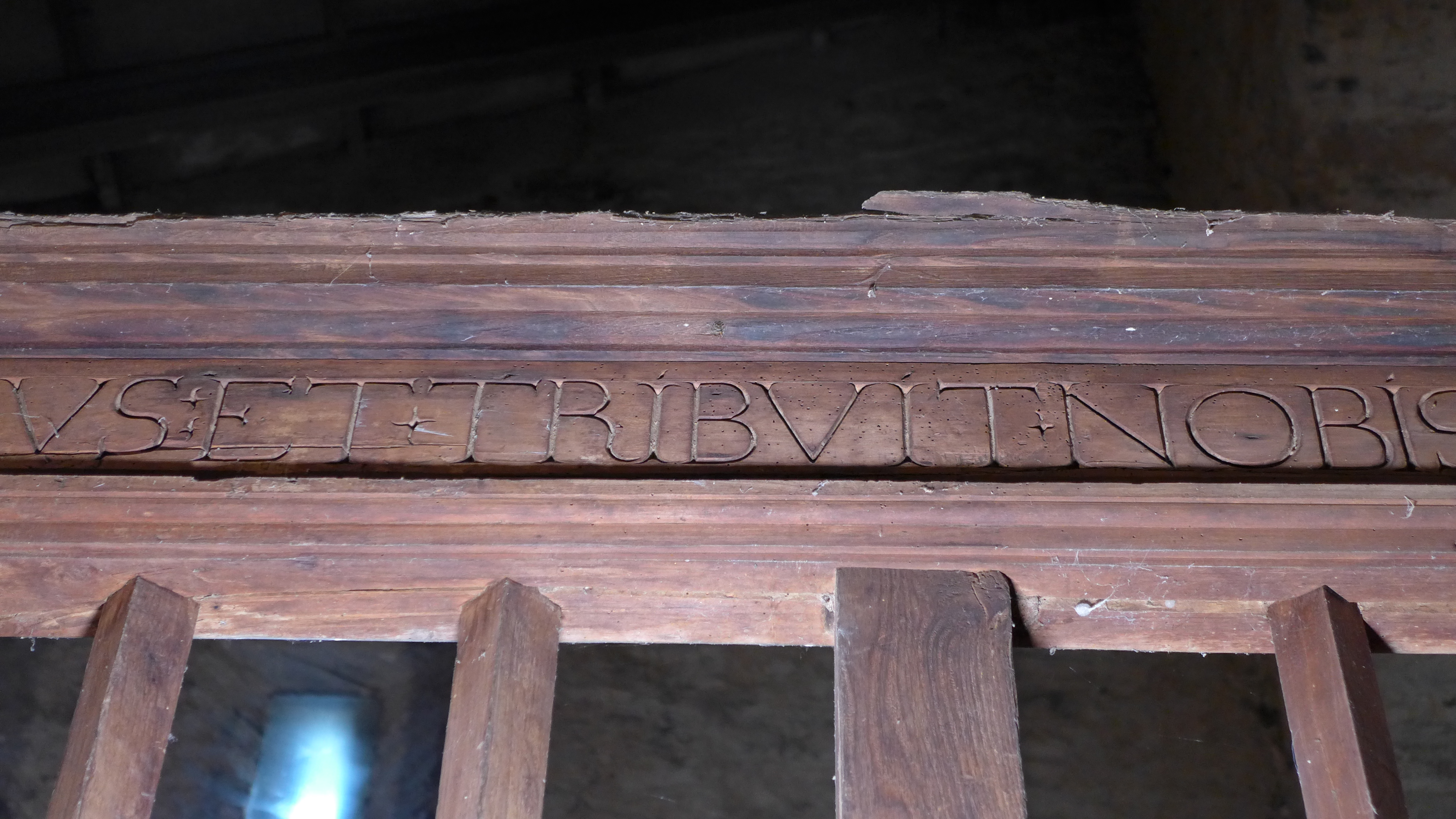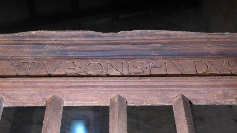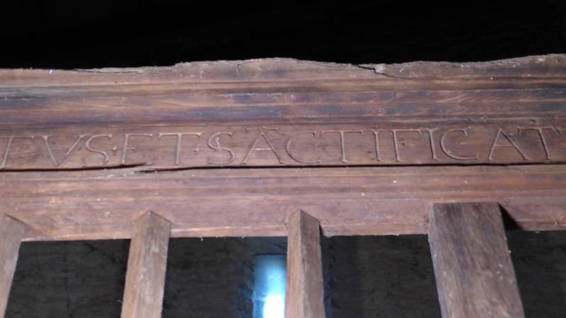 Contiene una inscripción en la viga de coronamiento escrita en capitales humanísticas. Dice: