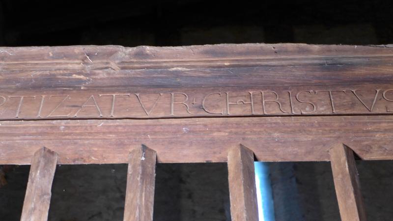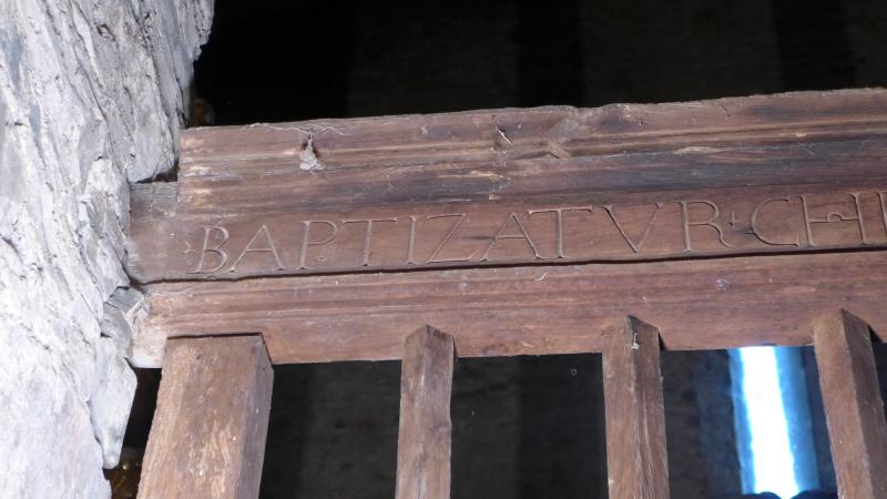 (Baptizatur Christus et sanctificatur omnis mundus et tribuit nobis remissionem peccatorvm), que corresponde a una antífona del día de la Epifanía, mensaje consecuente con el uso baptisterial de la estancia que protege.