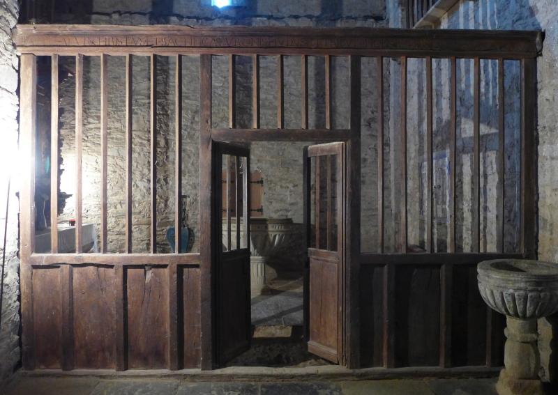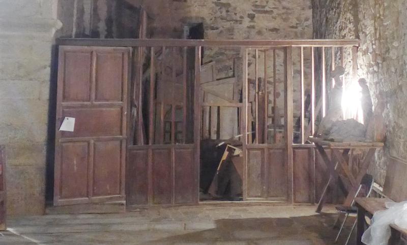 Parece prácticamente gemelo al cancel de la trastera, que está en el último tramo de la nave norte, con las adaptaciones correspondientes al espacio y uso. El de la trastera, por su naturaleza, lleva las hojas de la puerta central hasta la viga de coronación, sin montante, y abre una puerta para el acceso a la escalera de coro en su parte meridional.