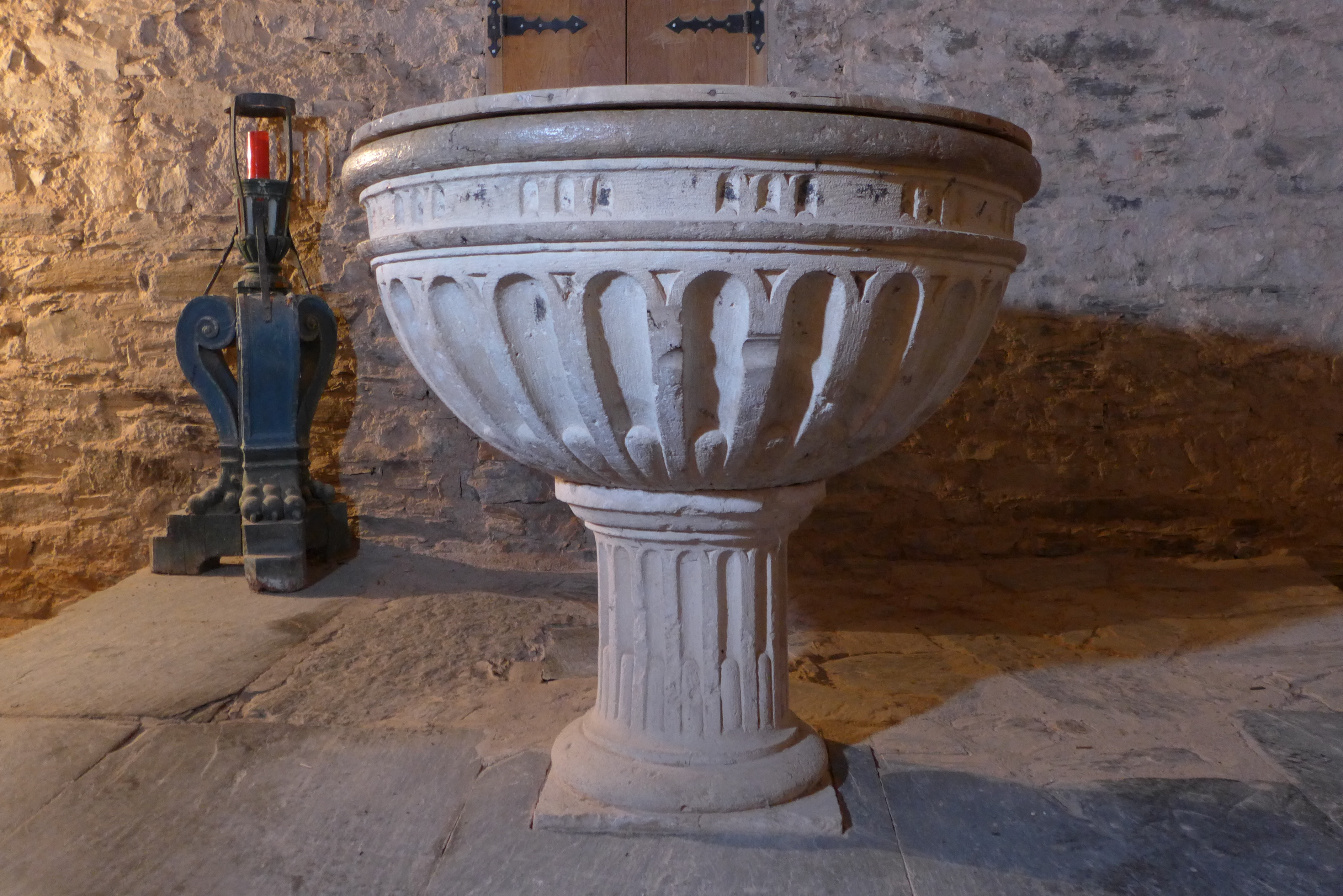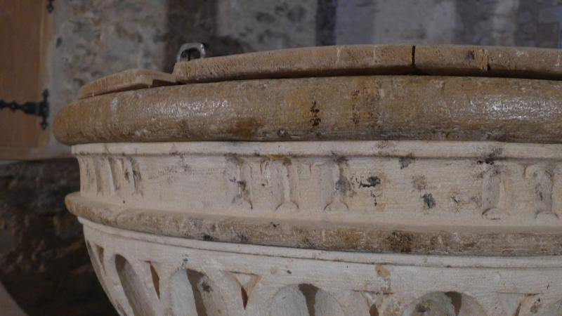 Pila de piedra caliza compuesta de basa (actualmente apenas visibles por estar enterradas las gradas), pie de sección circular y copa hemiesférica adornada con elegantes gallones excavados en su parte inferior, un friso perimetral con conjuntos de tres gotas también excavadas, y grueso bocel.