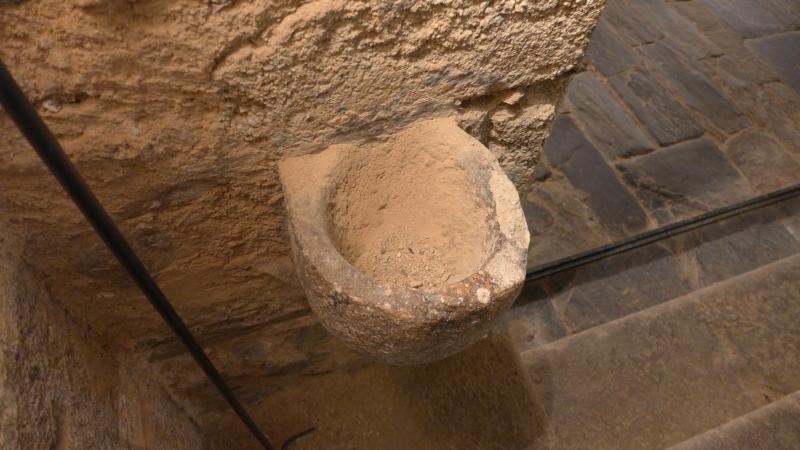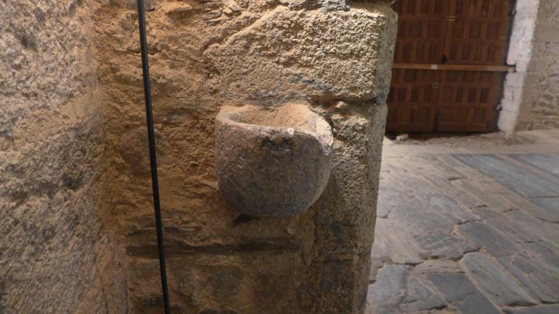 Pequeña pila benditera embutida en el muro, de desarrollo troncocónico ligeramente redondeado con su interior cóncavo labrado de forma hemiesférica.