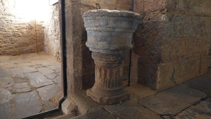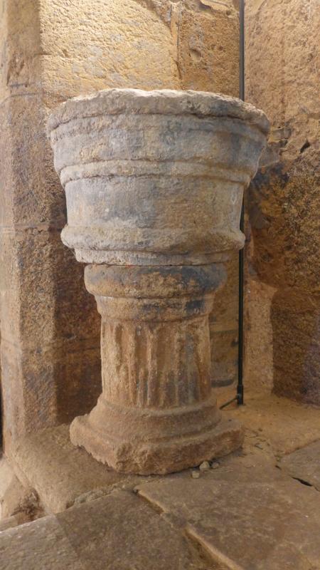 Pila de piedra caliza compuesta de dos piezas distintas. La copa, troncocónica, dispone de un bocel en la parte inferior y en la superior, con rebajes moldurados en su cuerpo. El pie, circular, es estriado. Se dispone directamente sobre el solado