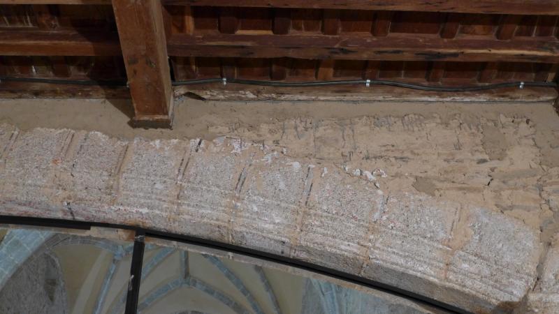 Se imita una junta de sillares con doble línea negra, y estampillado rojizo sobre fondo blanco en el intradós
