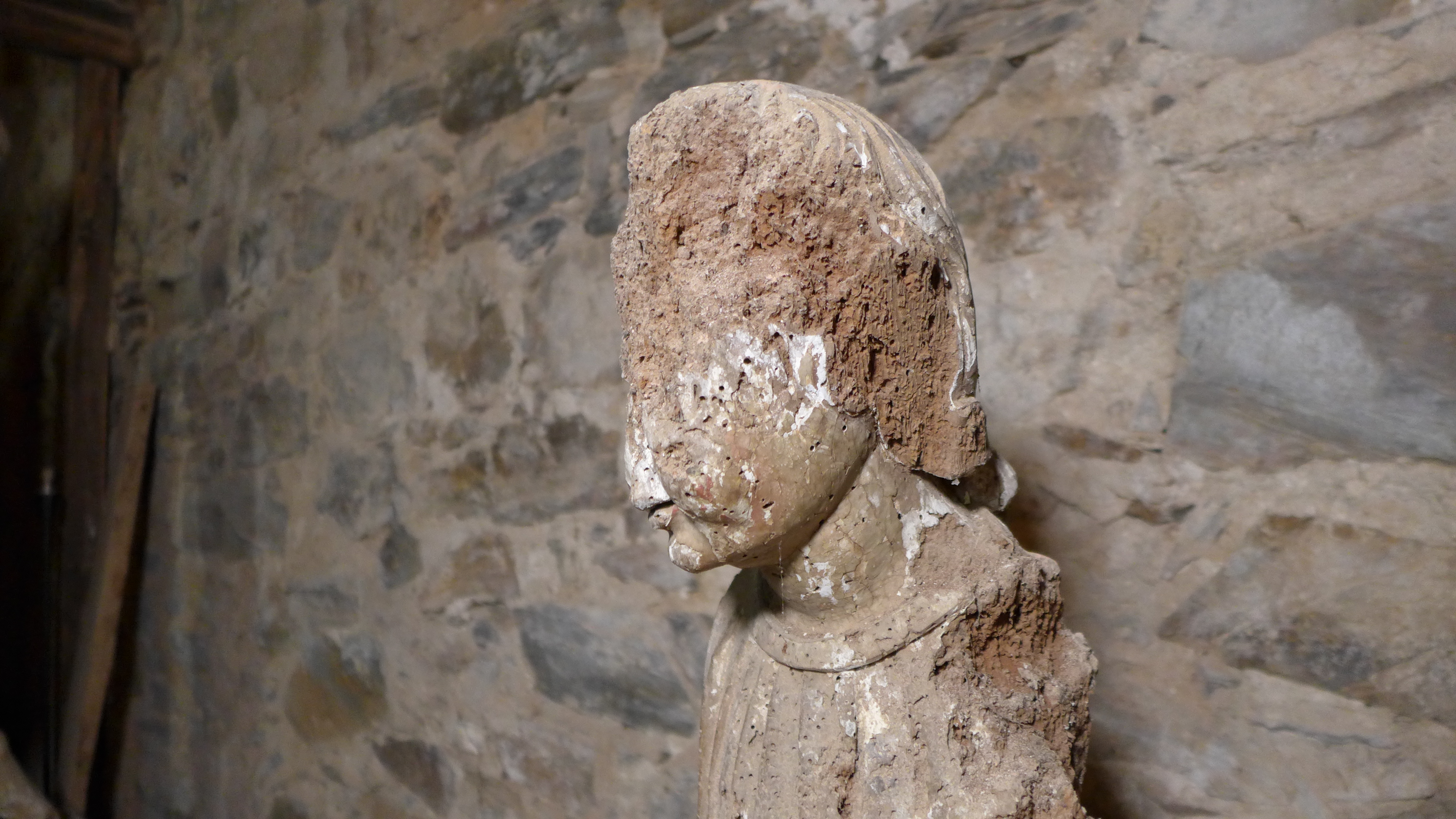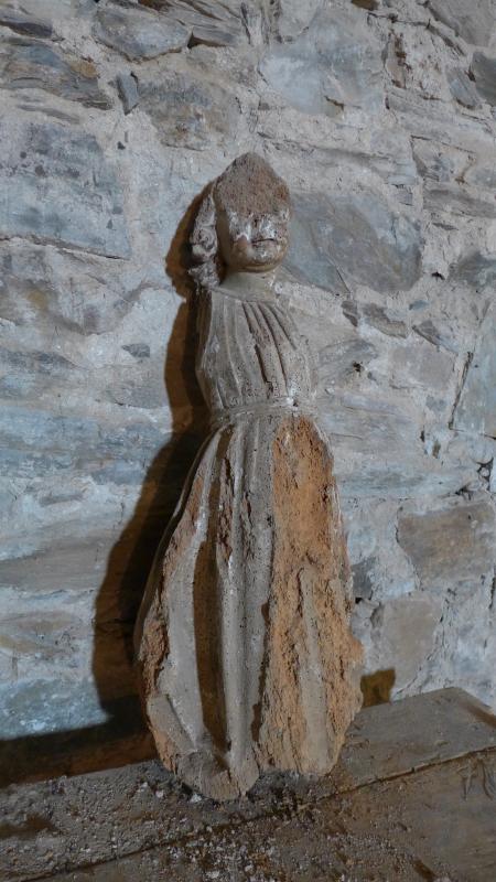 La parte posterior, así como su base, están talladas con pliegues, del ropaje.