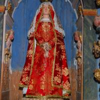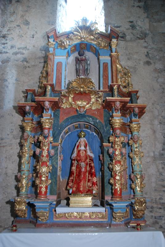 Retablo formado por un único cuerpo y ático desarrollado. El cuerpo se organiza mediante parejas de pilastras cajeadas, sitas en dos planos distintos, y columnas de fuste liso cuajadas de cabezas de querubines y otros ornatos barroquizantes, para flanquear la hornacina central, que se corona por una tarja de airoso vuelo. En la hornacina, la titular, bajo arco de medio punto .
