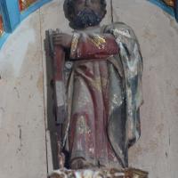 El ático, mucho más sencillo y flanqueado por humildes estípites lisos, abre una hornacina de medio punto para San Andrés, con artesones en su intradós. Otra tarja, entre el amago de frontón quebrado, lo culmina.