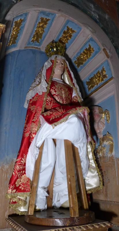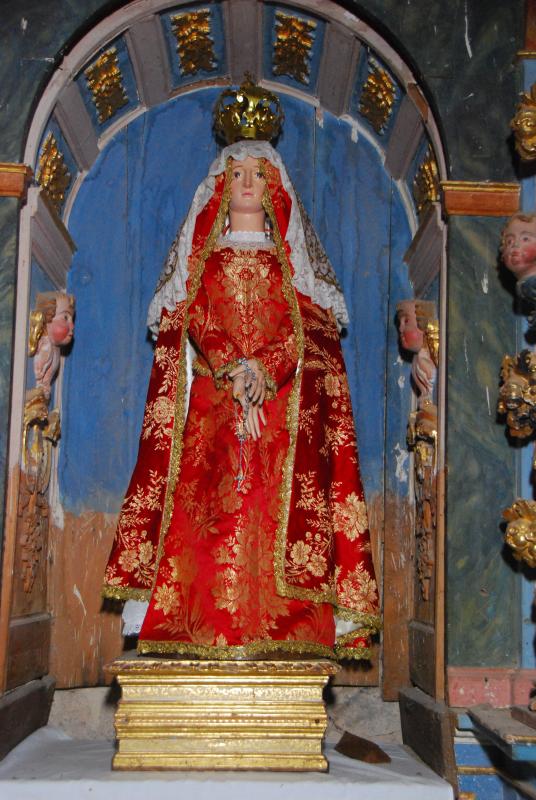 Imagen vestidera (de bastidor) de factura popular, a la que únicamente se tallaron manos y cabeza, como es habitual en este tipo, Su mirada ensimismada y de ojos enormes denota las limitaciones del artista.