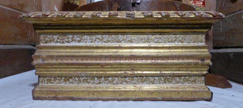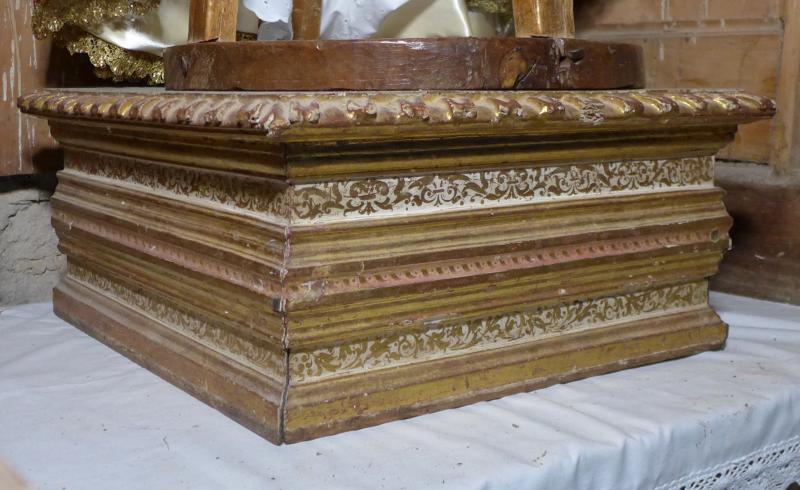 Peana prismática, moldurada, animada con dos frisos estofados sobre color blanco