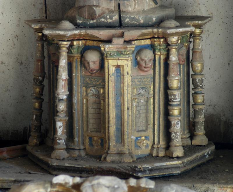 Peana poligonal achaflanada con columnillas por delante de cada chaflán que sostienen una cornisa con cierto vuelo. Las facetas que se pueden ver de la peana se dividen horizontalmente en dos partes, la superior de las cuales contienen altorrelieves con cabezas y la inferior hornacinas huecas.