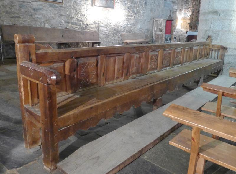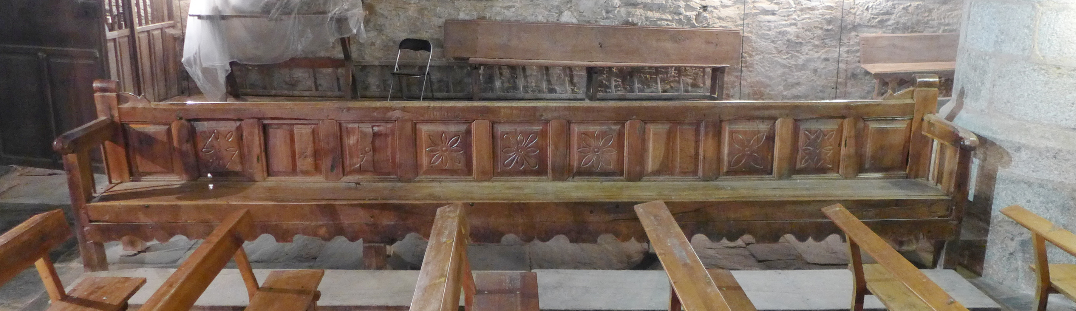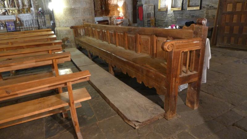 Dos escaños gemelos, de tamaño inusualmente grandes (más de cinco metros de largo, con pieza única para asiento) con poderosos brazos que rematan con volutas.