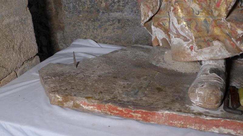 Falta el Niño que habría de acompañarle, como demuestra el clavo de su peana. Especulamos con la posibilidad de que fuese la talla que quizá se trate de un ¿Niño Jesús? (ver ficha), pero no parece opción clara por la basa de dicha talla, que no está pensada para ser fijada desde abajo.