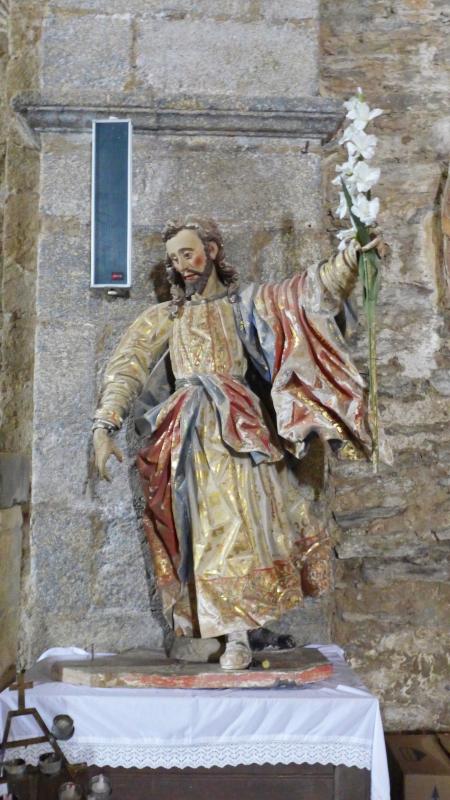 Escultura de bulto redondo de San José que originariamente debió de ser un grupo de San José con el Niño, pero en el que se ha perdido el infante. Así lo denunciaría también la postura de la mano derecha del santo. Es una imagen barroca, bien compuesta, de movidos y quebrados paños, que nos presenta al patriarca en pie, al paso, con el brazo izquierdo levantado para asir un bastón o vara y con el derecho hacia abajo para sujetar al infante. Viste túnica larga ceñida a la cintura y manto descolgado que se enrolla entre el cinturón y el brazo izquierdo. Su cabeza dirige la mirada hacia abajo, donde estaría el Niño, muestra rostro escasamente expresivo, melena larga que le cae sobre los hombros, barba bífida y rasgos afilados. Aunque desconocemos su autoría, lo cierto es que su hechura recuerda a la de otras imágenes vista en las iglesia de la Tebaida.