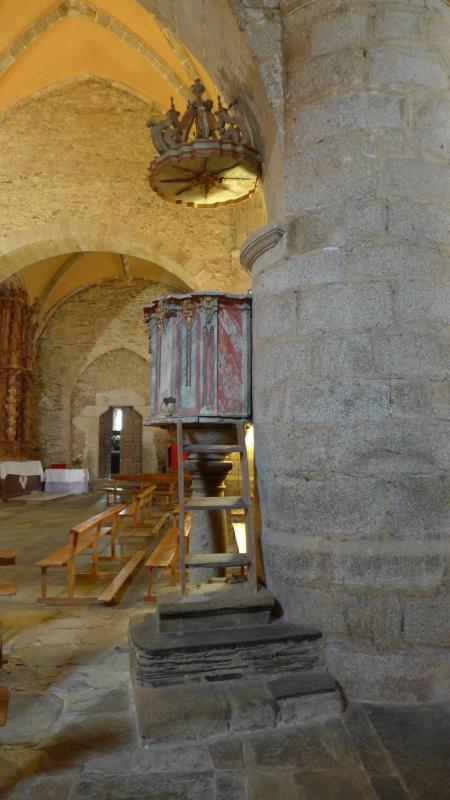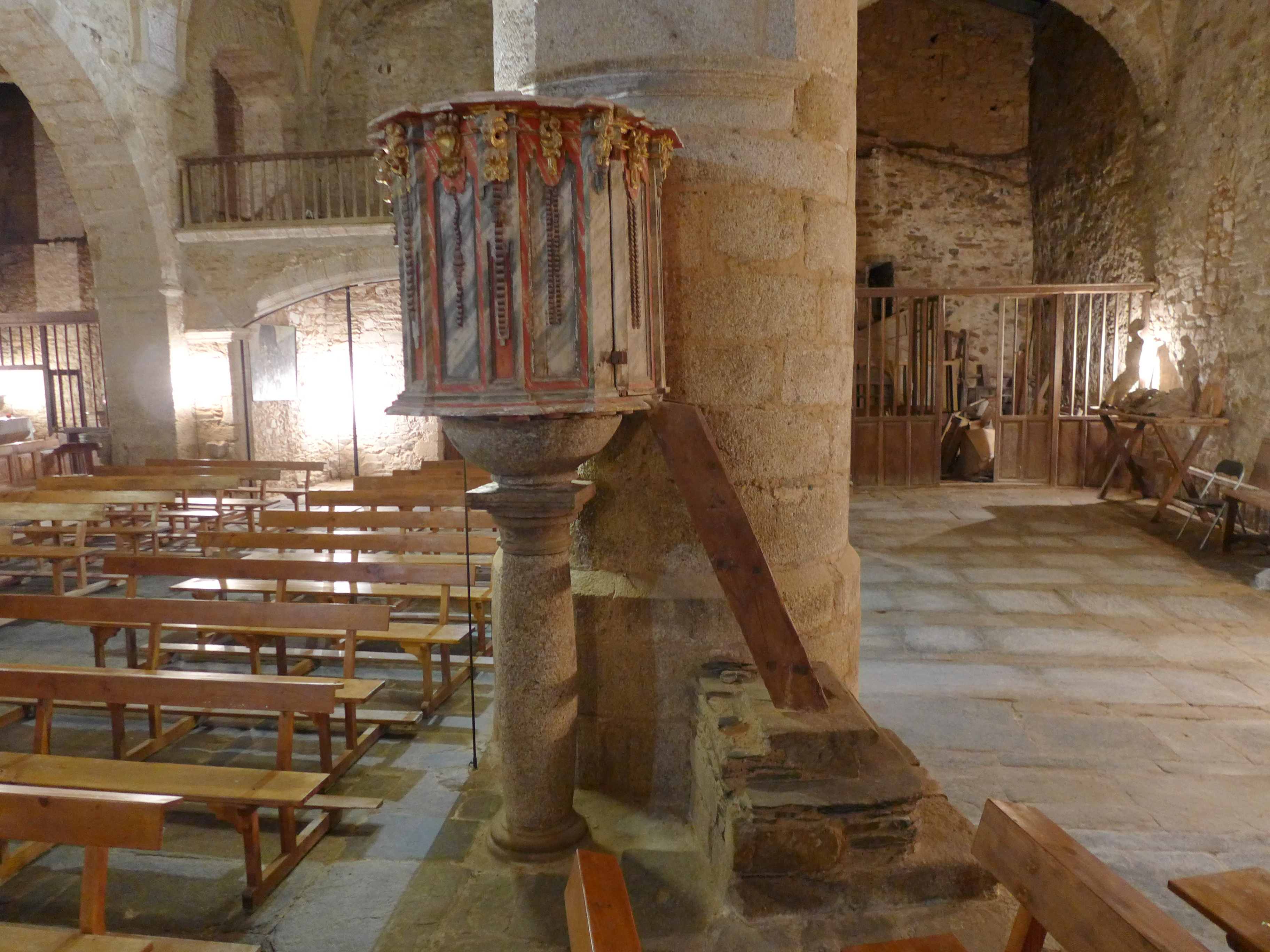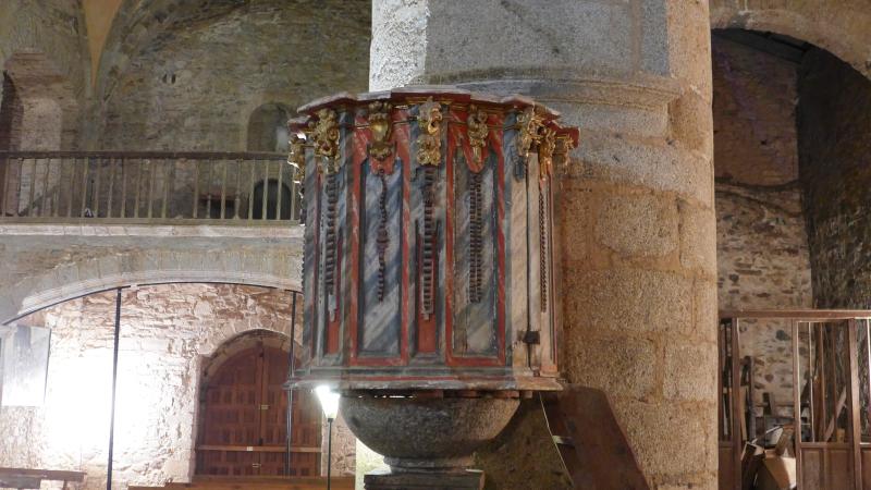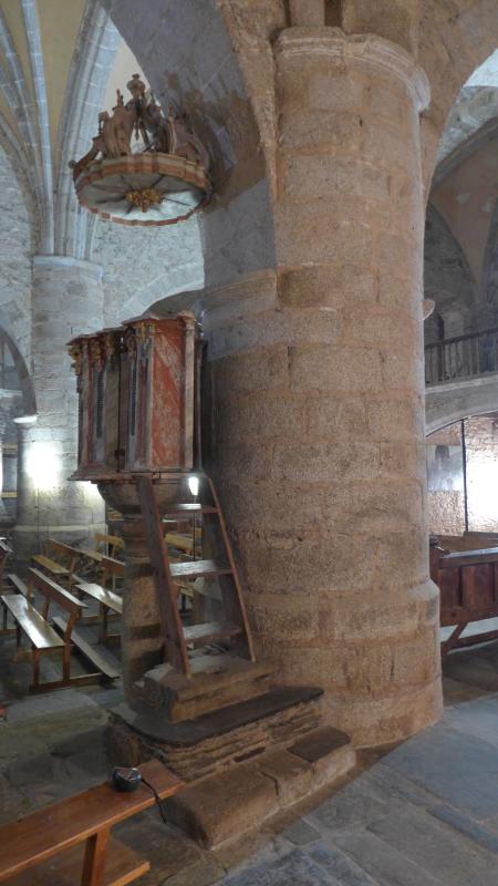 Púlpito de madera y piedra compuesto de tribuna, pie y tornavoz (estos dos, con ficha propia), con sus correspondientes escaleras para acceder a la tribuna.