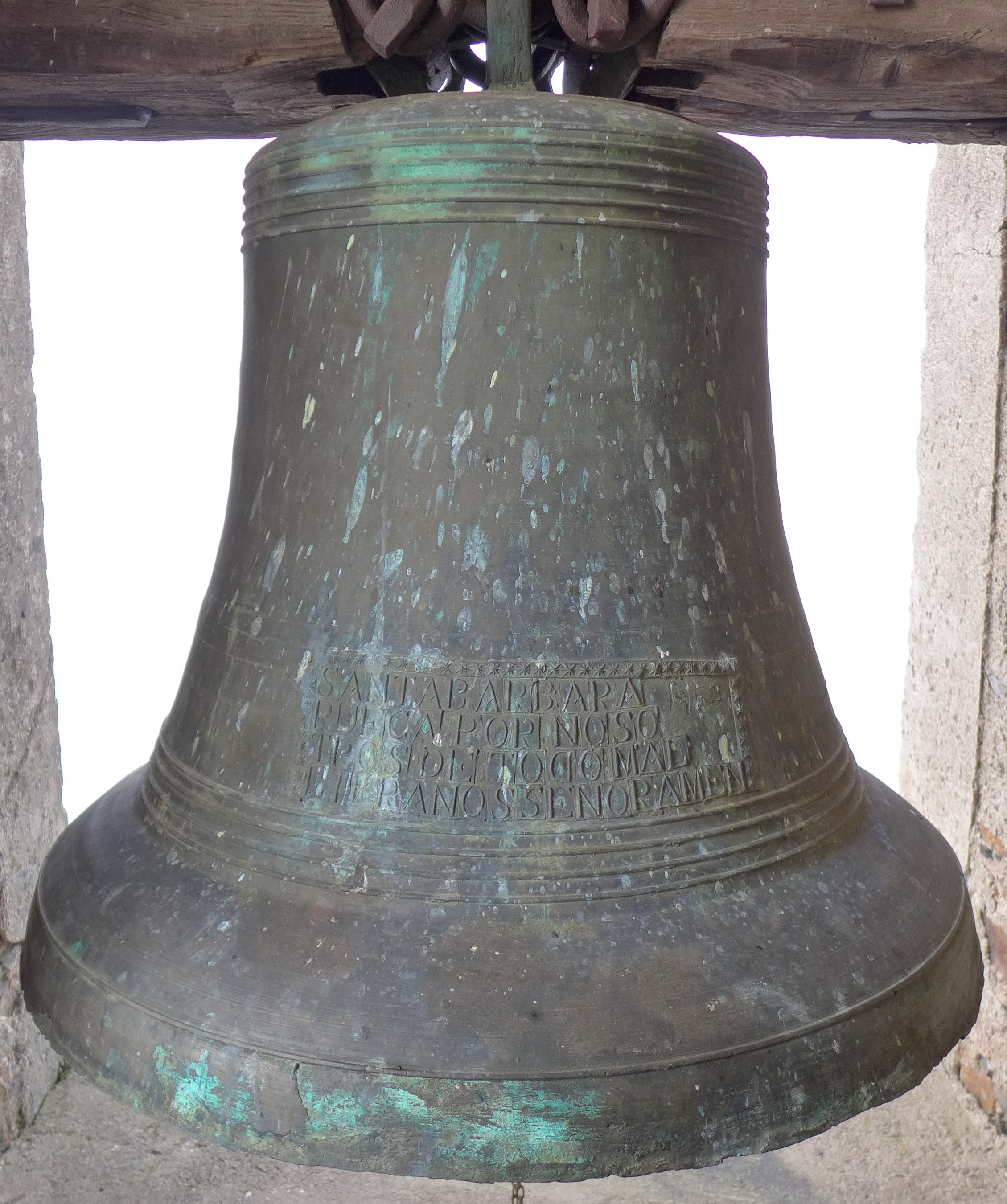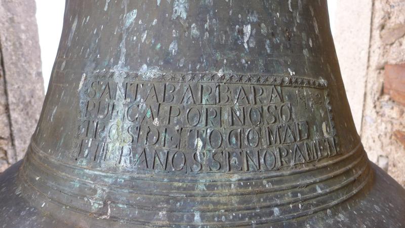 Campana de perfil esquilonado, pareja de la otra compañera de tronera por tipo, decoración y año de fundición. Su tercio se decora con seis cordones. Su medio pie contiene una gran inscripción con letras mayúsculas en cuatro líneas, enmarcada por moldes de estrellas de ocho puntas, excepto en su parte inferior, que limita con cuatro cordones que adornan el pie. Su texto dice: SANTA BARBARA / RUEGA POR NOSO / TROS DE TODO MAL / LIBRANOS SENOR AMEN. El molde de la D está invertido. En una esquina libre de texto se aprovechó para grafitear en negativo sobre el molde de la campana la fecha de la fundición a mano alzada: 1952. En el lado opuesto del medio pie campea una estilizada cruz de calvario sobre tres gradas. Sus moldes (cual alquerques de cinco) son rectangulares en dichas gradas y romboidales en los travesaños, con un cuadrón formado por cuatro de ellos y “patibulum” con apenas un molde por lado, así como en el remate del “stipes”.
