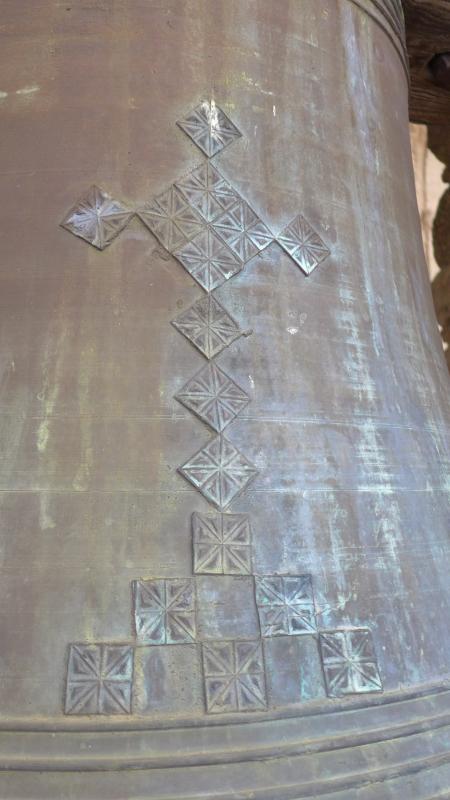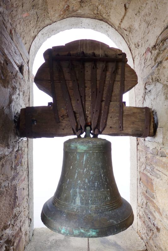 La campana se sostiene por yugo de madera y conserva el badajo.