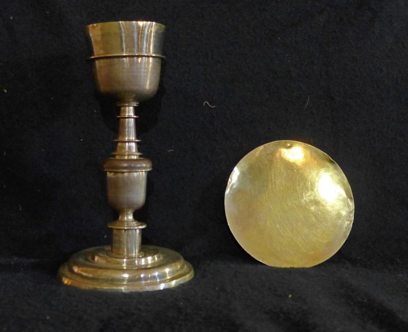 Sencillo juego de cáliz y patena como tantos otros que se hicieron en los talleres del norte peninsular a comienzos del barroco. El cáliz repite el modelo clásico de pie moldurado de diversas alturas y perfiles, jugando con formas rectas y convexas. El astil principia en un gollete de tipo carrete, sobre el que monta el típico nudo ajarronado -aunque especialmente desarrollado- y una serie de cuellos troncocónicos. La copa, de perfil acampanado lleva listel decorativo hacia la mitad de la misma y labios ligeramente abiertos. La patena es circular y dorada, sin ninguna particularidad reseñable.