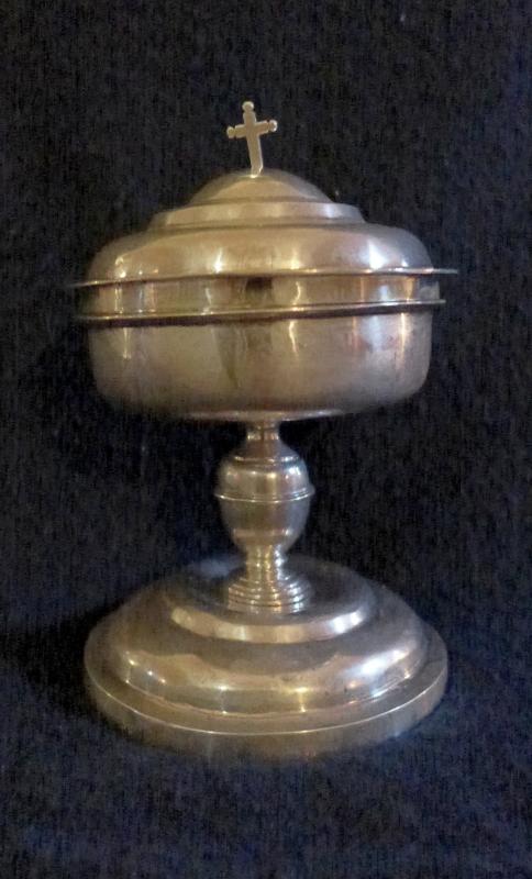 Copón de pie abullonado de tres alturas, las dos exteriores de perfil recto, la central convexa. En el centro se ajusta el astil, de nudo ovoidal y una serie de molduras y cuellos arribas y abajo para dotarle de cierta altura. La copa tiene perfil cilíndrico, roto únicamente por la pestaña que aflora en su parte superior y que sirve para encajar la tapadera. Esta última se asemeja a la propia basa del copón, pero invirtiendo los perfiles en sus tres alturas. Como remate lleva una pequeña cruz latina de brazos rectos y terminaciones circulares.