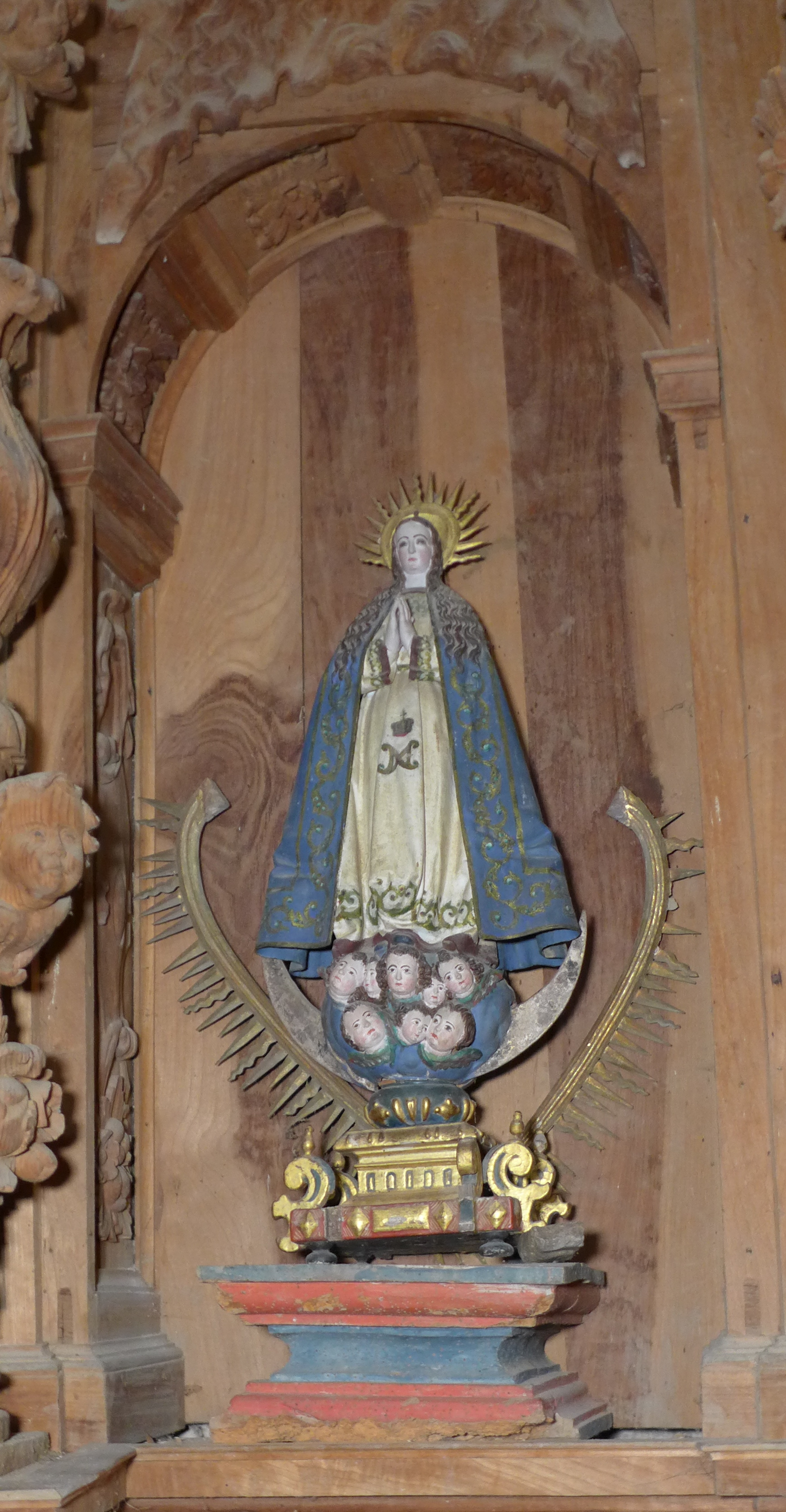 La talla se asienta sobre una peana solidaria (otra peana, que tiene ficha propia, sobreeleva la imagen) por encima de la cual se desarrolla un bulbo de cabezas de querubines, con un generoso cuarto lunar por detrás. De la peana emerge un resplandor de latón refulgente en forma de uve que alterna rayos rectos y flameados, rayos que también emergen de su corona.