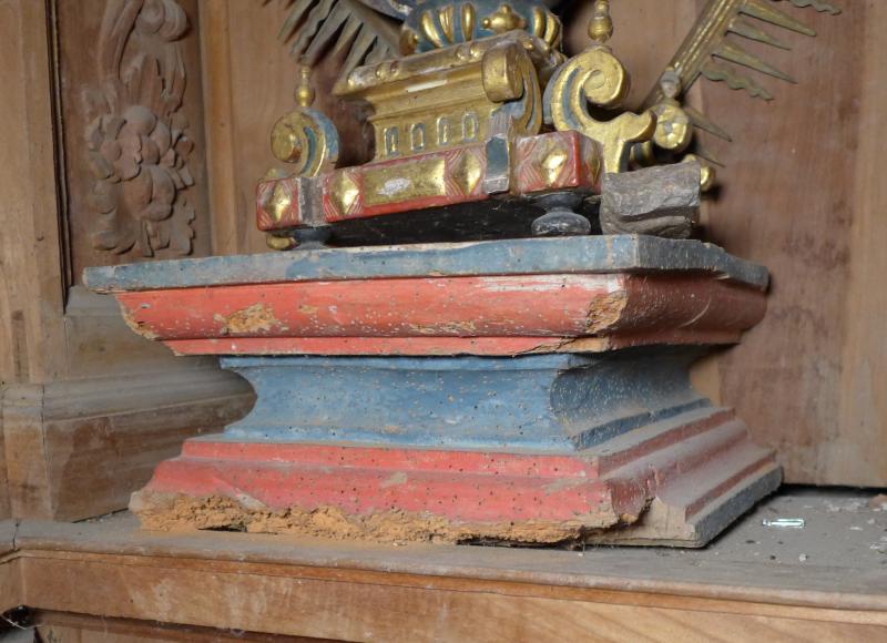 Sencilla peana moldurada y policromada, simétrica y estrechada en su parte central por una generosa escocia.
