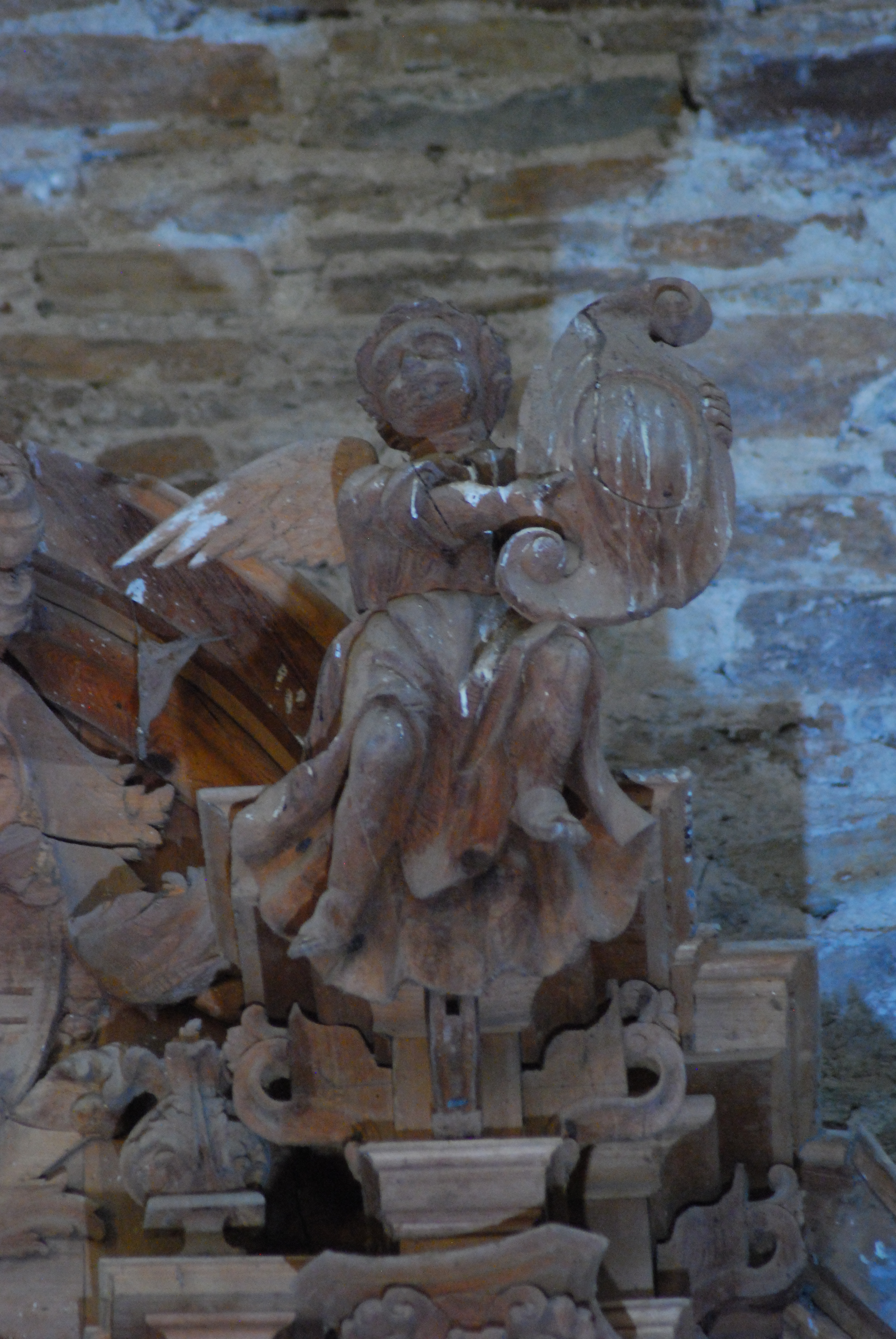 Ángel tenante sentado, en su color como el resto del retablo, que sostiene entre sus dos manos una cartela muda en forma de cuero recortado.
