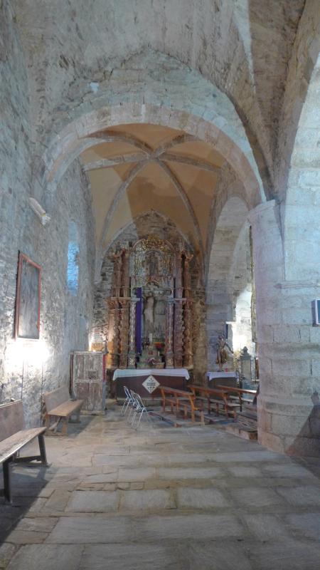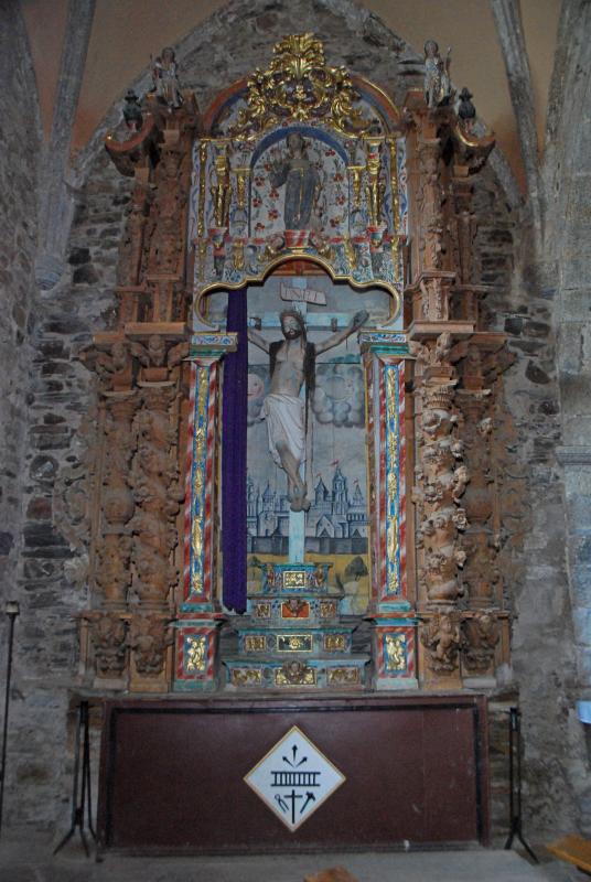 Curioso retablo barroco, tanto por la poco acostumbrada proporción del ático, como por su acabado, pues alterna una parte (la exterior) en su color, sin policromar, y una interior abigarrada con los colores chillones propios del gusto popular berciano de finales del siglo XVIII. La tabla del fondo del Cristo, en grisalla, dibuja una esmerada Jerusalén, con cierto detalle en la arquitectura de los edificios.
