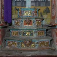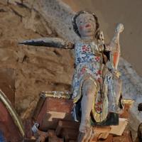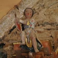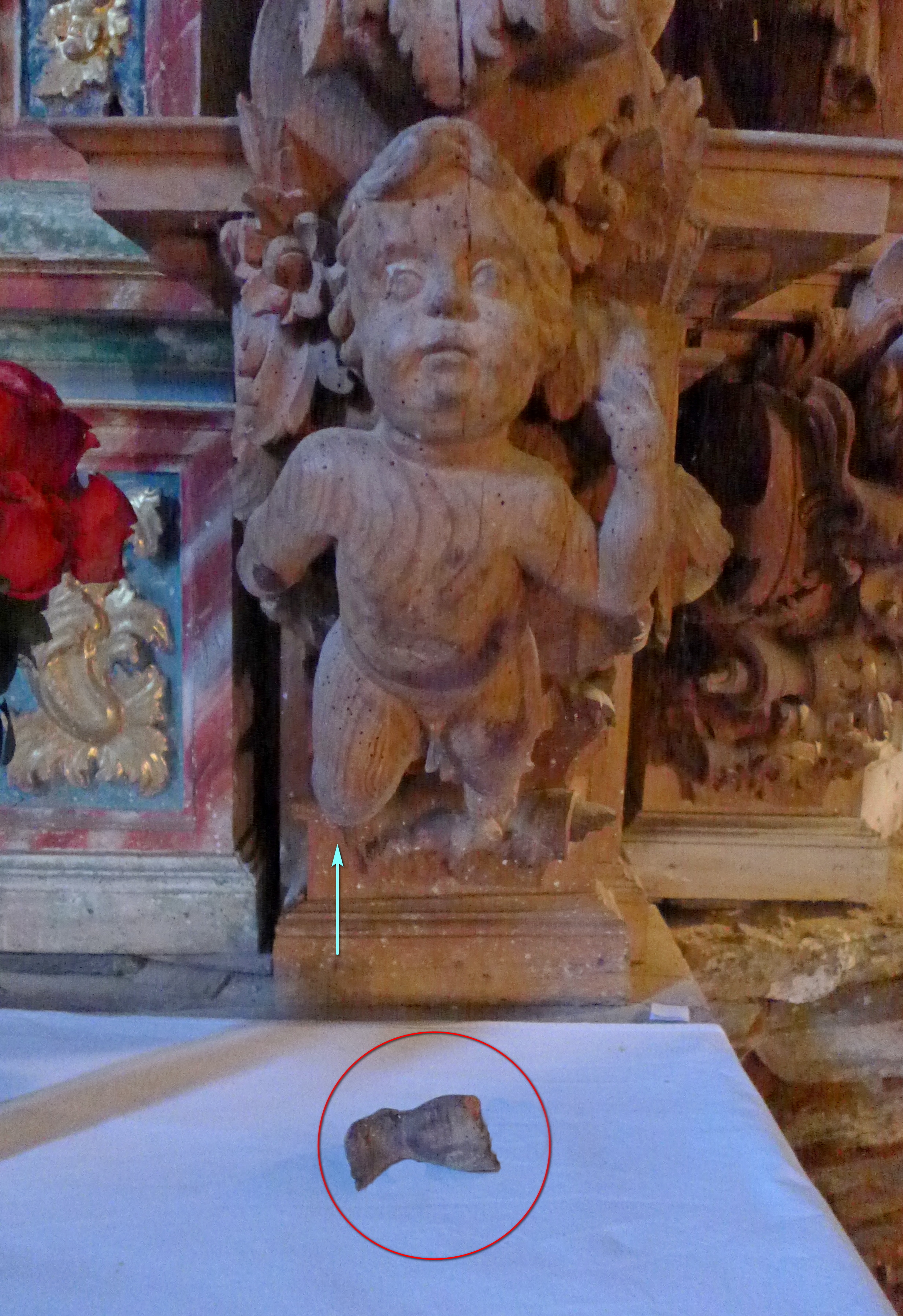 Al ángel tallado en la ménsula derecha (según se mira) del banco le falta el parte de la pierna derecha, resto que encontramos examinando el retablo, lejos de su posición.