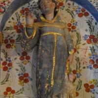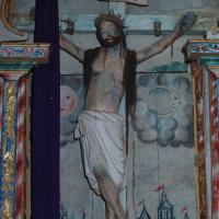 El cuerpo central abre su hornacina de manera crucífera, tratamiento extendido en retablos de esta época cuando el titular es el Crucificado, abertura que prácticamente ocupa por entero el espacio. En el ático, una habitual hornacina de medio punto de poca profundidad muestra una imagen en bulto, que se beneficia del carácter convexo de su base-peana, integrada en la arquitectura del retablo. Se trata de un santo franciscano.