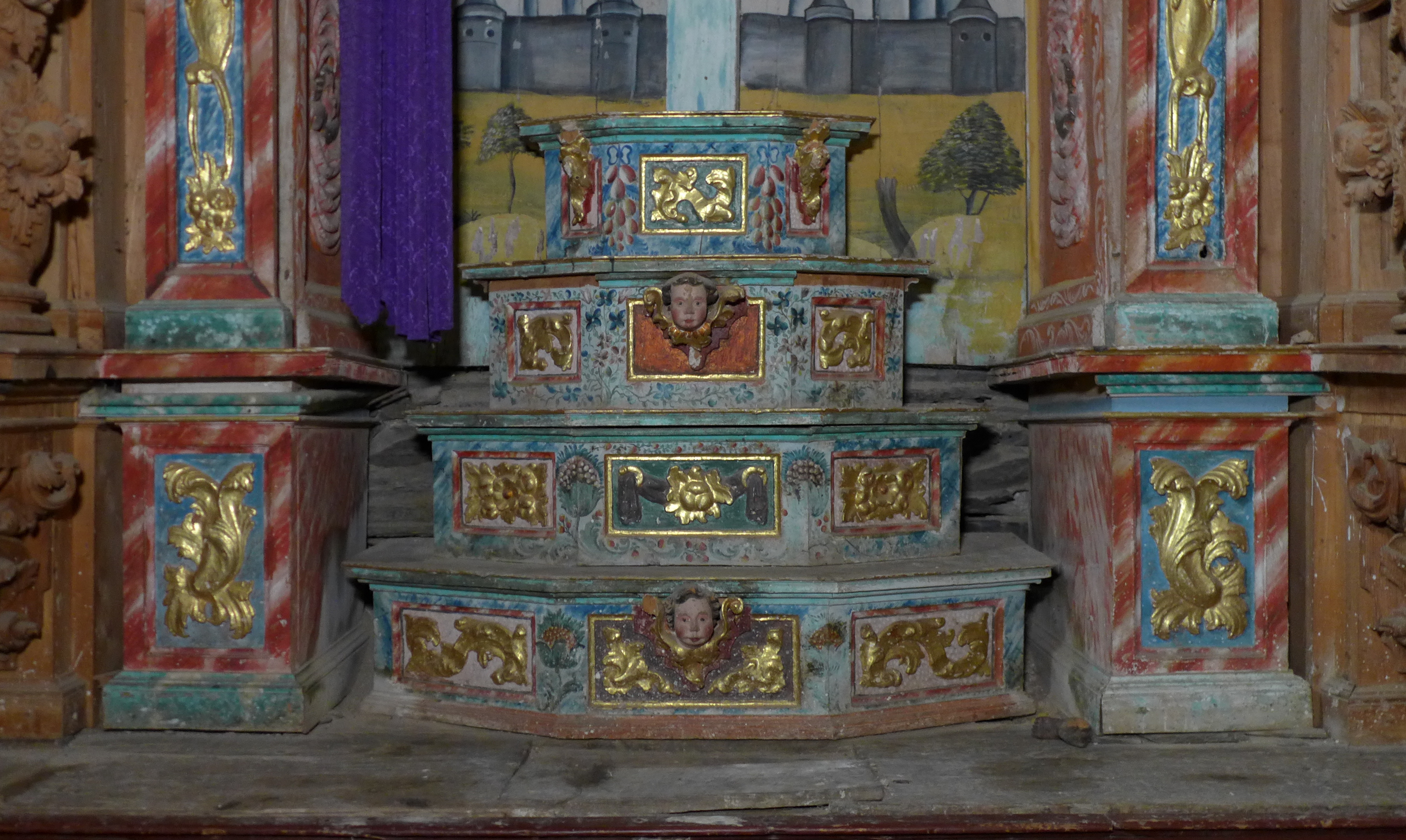 Cuatro gradas poligonales (medio octógono), con la tradicional merma ascendente, policromadas, y con casetones en sus partes visibles decoradas con cueros recortados y cabezas de querubines, doradas.