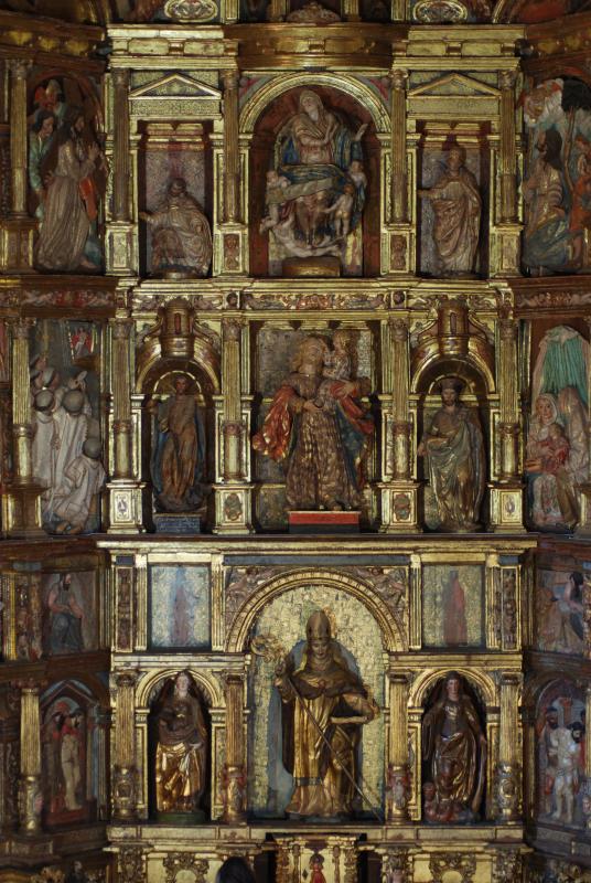 La principal estridencia (sin entrar en el banco barroco añadido) la encontramos en el primer cuerpo, que se divide en dos alturas, la primera jalonada por órdenes clásicos y a segunda pilastras cuajadas de abultada talla; aun de distinto tamaño ambas se pensaron para recibir imágenes de bulto, aunque las primeras dentro de hornacinas aveneradas y las segundas en pequeños encasamientos cuadrangulares. Los dos pisos superiores no plantean tales problemas, aunque en ellos las calles laterales se dedicaron a relieves y la central y sus entrecalles a imaginería, todas ellas cajas rectangulares y ventanas tabernáculo. En ese sentido, sólo se rompe ligeramente la articulación en la calle central, cuyas cajas suelen ser de mayor tamaño aunque no desbordan los respectivos entablamentos. Por último, la coronación del retablo se realiza mediante varios frontones que alternan sus formas y en el centro una suerte de tabernáculo ochavado de dos pisos, único espacio pensado para alojar pinturas.