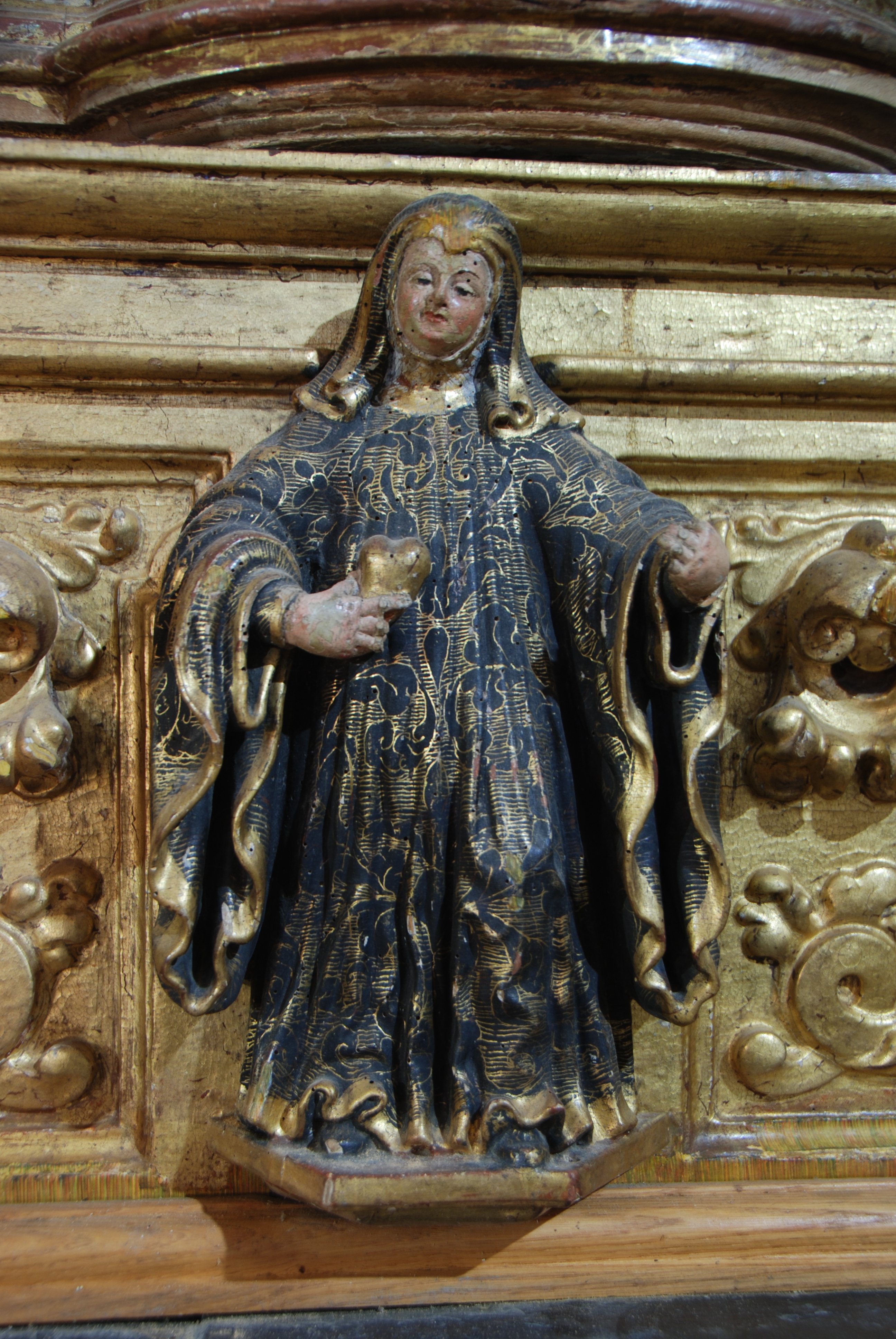 Sostiene un corazón en su mano derecha, pegado al pecho, y adelanta el brazo izquierdo, donde quizá dispusiese un báculo, hoy perdido. En sus dedos se disponen los siete anillos, otro de sus atributos.