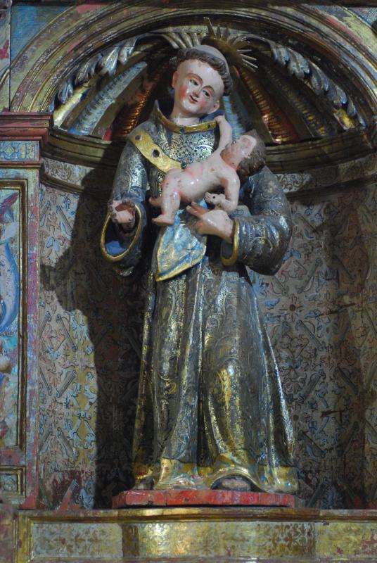 Talla de San Antonio, de pie. Tiene cabeza ladeada, con amplia tonsura, ojos de vidrio y expresión sonriente. Viste hábito dominico. En los ribetes frontales de cuello y cogulla dispuso de decoración de pedrería que se ha perdido, quedando los cabujones.