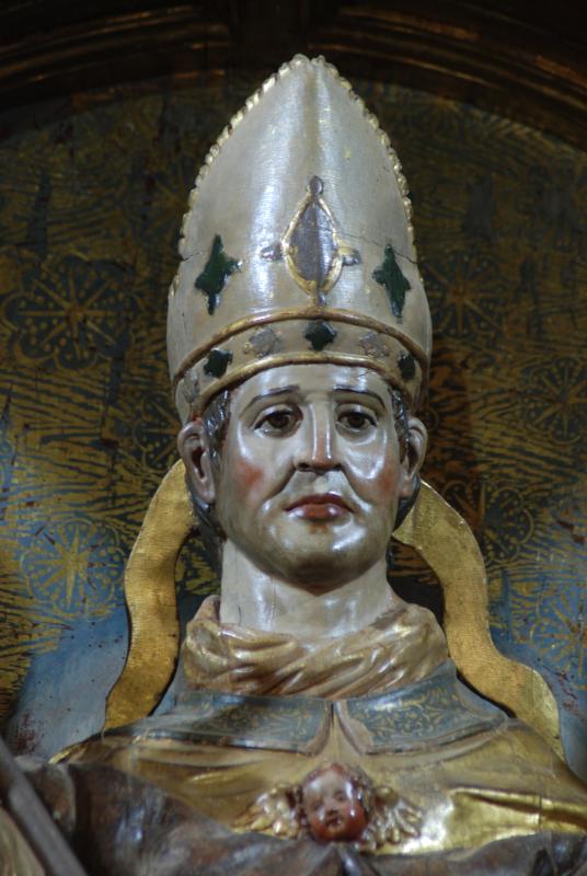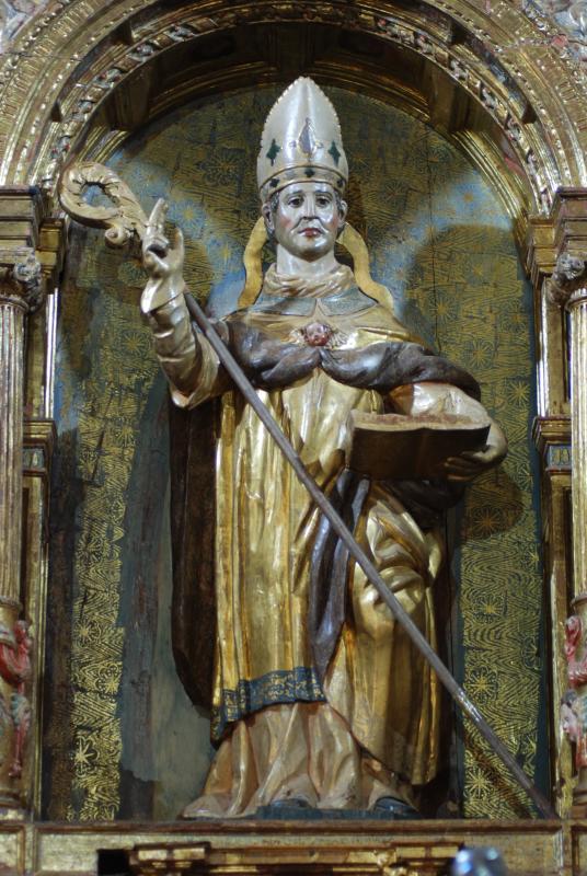 El santo aparece revestido con todos los atributos episcopales, acorde a la función de talla titular del retablo mayor (en el mismo, un tablero en relieve mostrará el episodio de la compartición de su capa con el pobre).