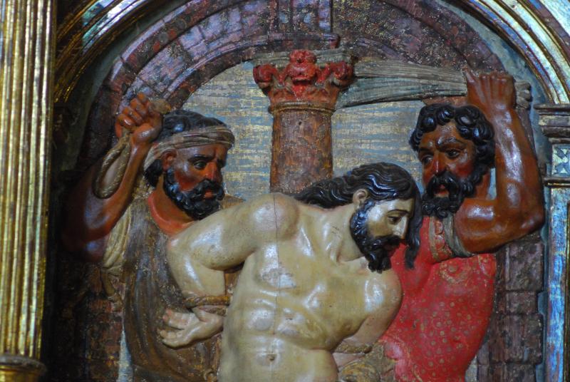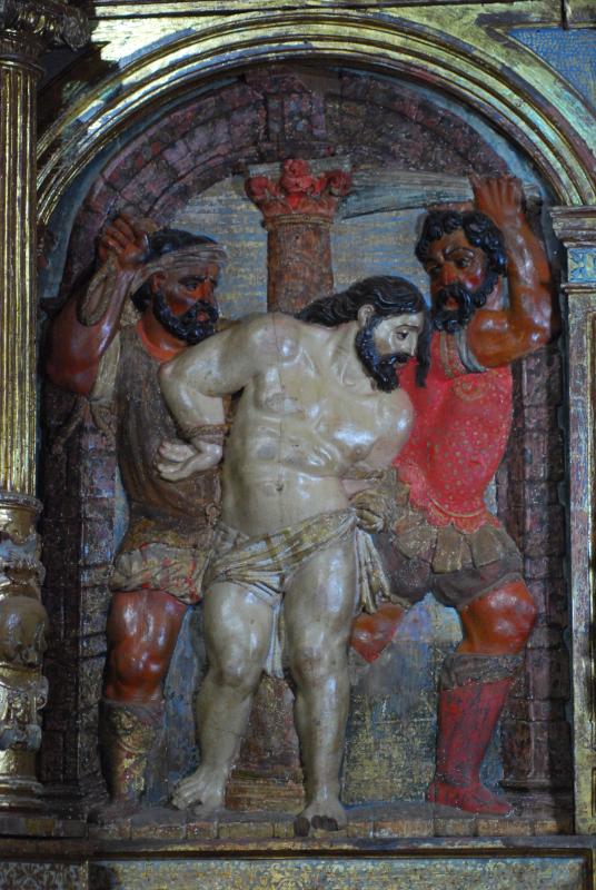 Bajo una bóveda que parece sostener la columna a la que se ha atado un hercúleo Cristo, Este, cuasi desnudo, es azotado sin piedad por dos sayones.