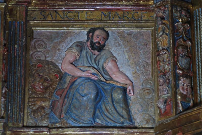El evangelista Marcos, barbado y con cabello corto, está sentado en disposición frontal en el centro del tablero, con vestido de manga corta y manto que le cubre las piernas, con un libro abierto entre las piernas que no escribe. A su lado, una desproporcionada cabeza de león identifica al personaje por su atributo. Su actitud es de profunda concentración, reflexiva.