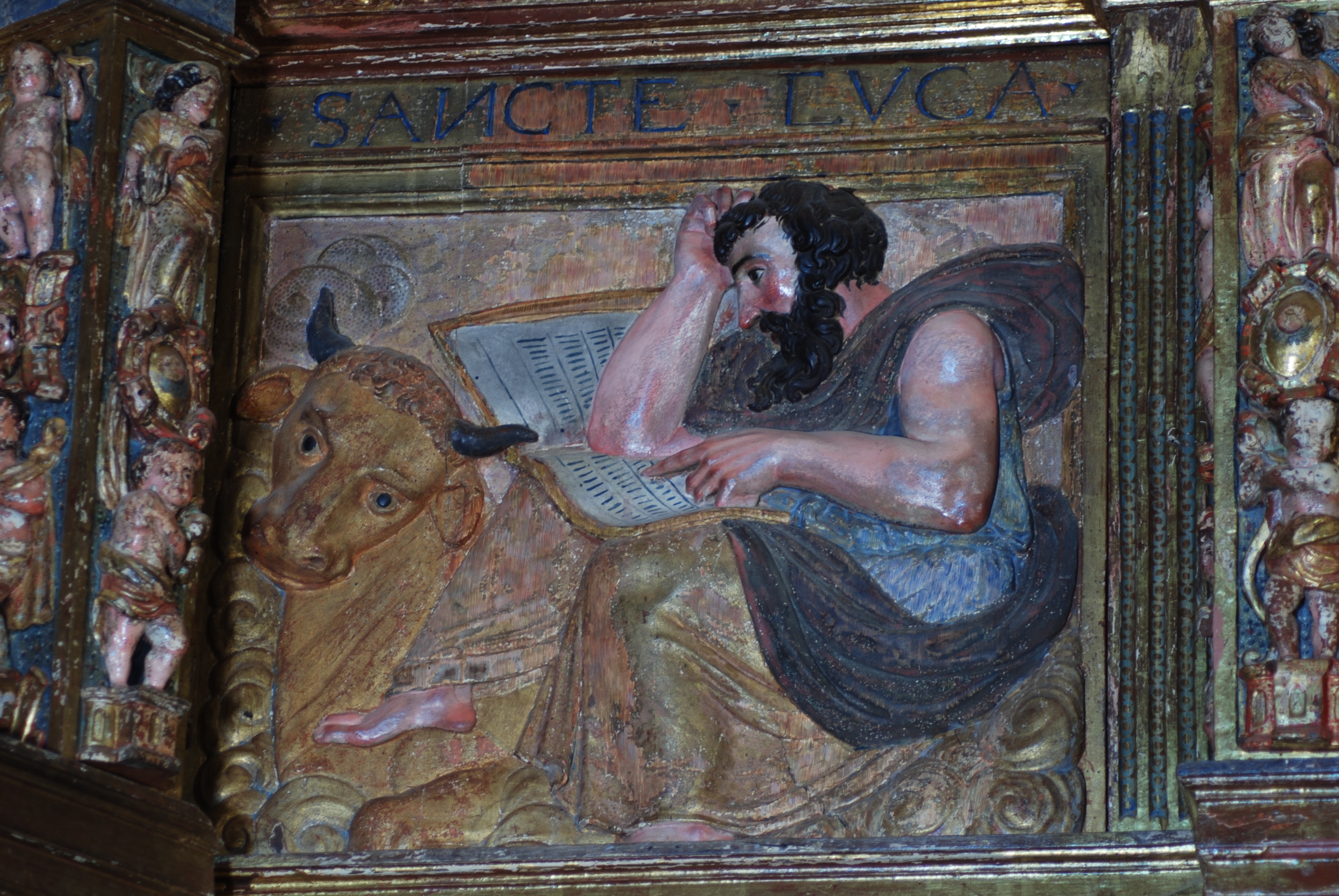 El evangelista Lucas, con larga barba y cabello corto crespo, se dispone en un lado del tablero, sentado de perfil. Porta vestido azul claro y manto oscuro, que rodea su cuerpo en zigzag. Apoya su hercúleo brazo derecho en un enorme pliego (el Evangelio que escribió), mientras señala con su mano izquierda una de las líneas, en actitud meditabunda. El pliego se apoya en un enorme toro, que parece ocupar la mitad de su composición, en alusión a su atributo, si bien se funden prácticamente las piernas del Evangelista y el animal, de la misma policromía.