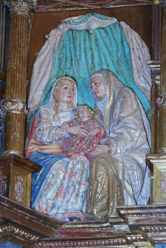 Muestra a Santa Ana y a la Virgen que, sentadas, entre ambas sostienen a un pequeño Cristo ataviado con un llamativo vestido de color rojo con estampados florales. También estampado es el vestido virginal, en tonos claros por debajo del manto azul con forro rojo. El vestido de santa Ana es más discreto.