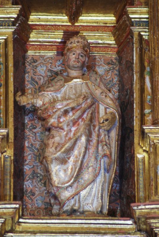 El discípulo de Cristo se representa de pie, barbilampiño, con la mirada perdida al frente y con los atributos episcopales, principalmente la tiara papal (primer obispo de Roma), así como lo que parecen unos guantes. Con la mano izquierda sostiene un libro cerrado. Si tuvo un báculo en su mano opuesta, lo que parece más probable, se ha perdido.