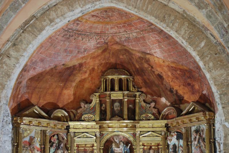 Cuando se intervino el retablo mayor (1992-1993) aparecieron antiguos revestimientos del casquete absidal. Dos, concretamente.