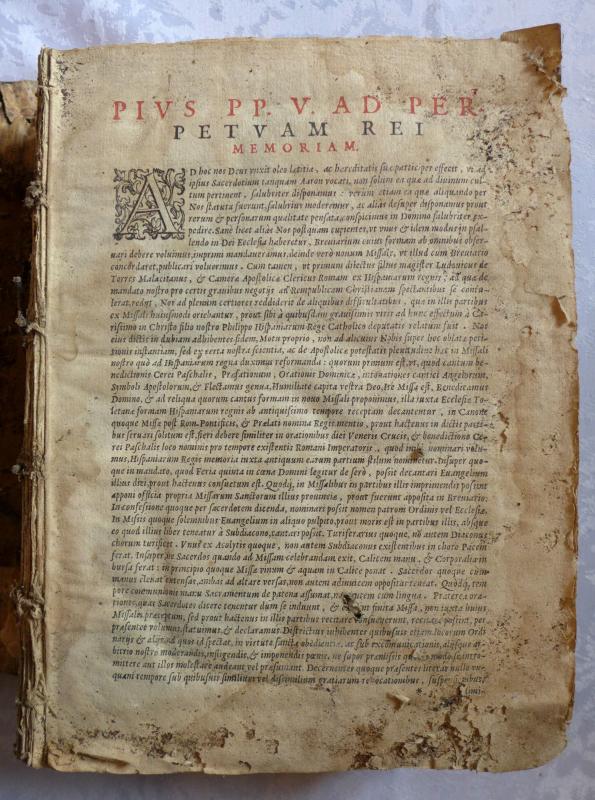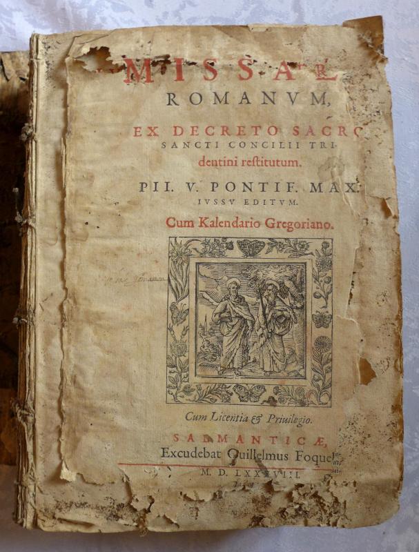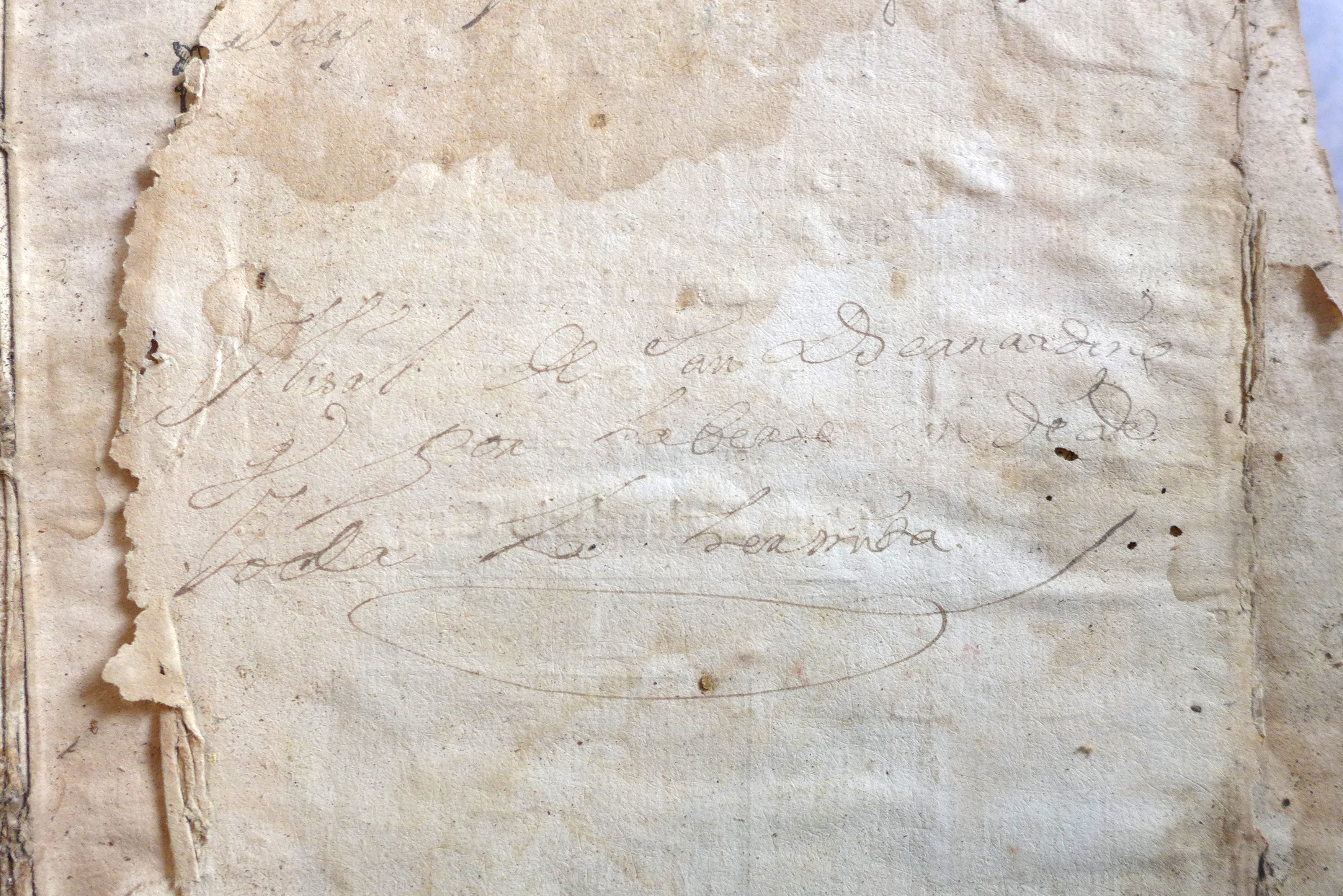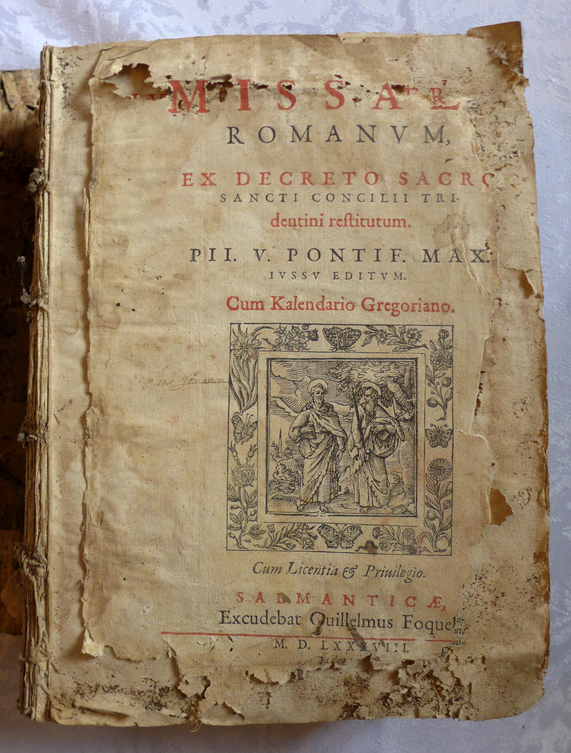 Anotación manuscrita (parece del siglo XIX) en una página de respeto suelta: "Misal de san Bernardino / que por haberse undido / toda la hermita".