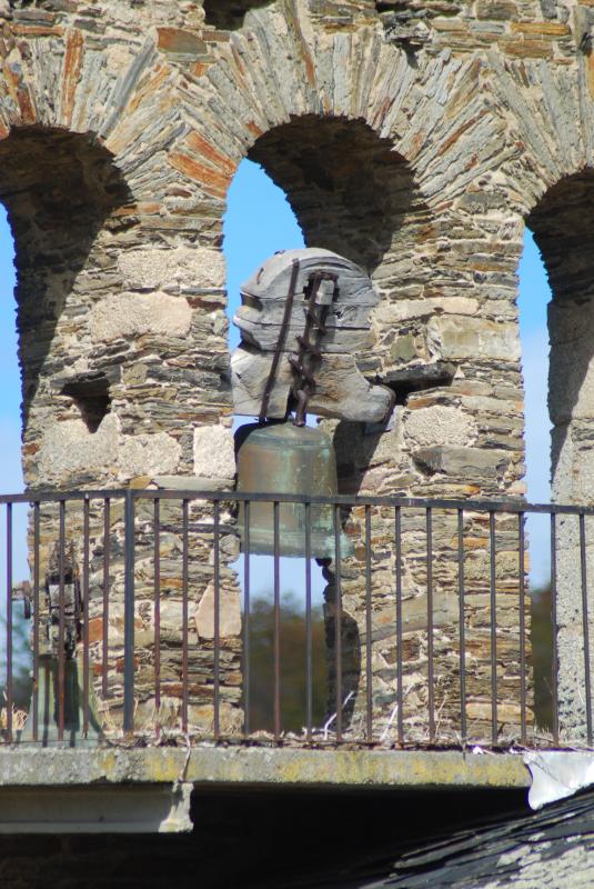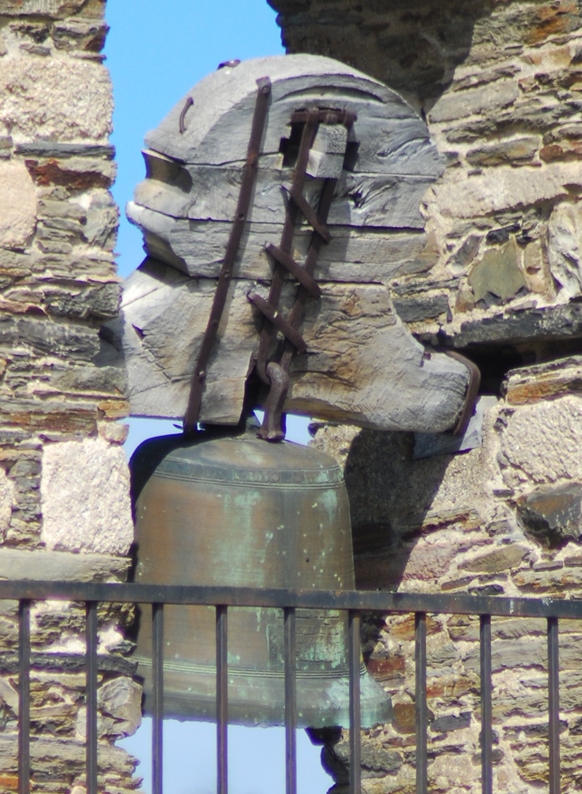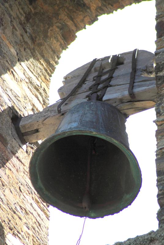 Campana de perfil esquilonado, Su tercio se decora con dos parejas de cordones entre los cuales corre una inscripción que no pudimos leer. Su medio pie contiene una gran inscripción con letras mayúsculas en cuatro líneas, enmarcada, que en su parte inferior limita con tres cordones que adornan el pie. En el lado opuesto del medio pie campea una estilizada cruz de calvario sobre gradas realizada con una línea de moldes.