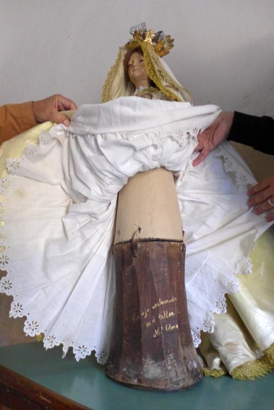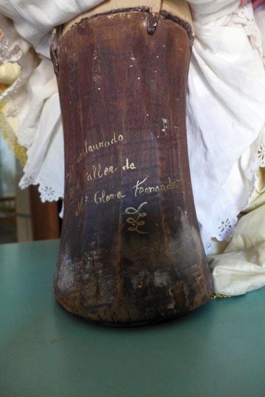 En el tronco que sirve sobre peana hay una inscripción manuscrita en tres líneas realizada con pintura dorada: "Trabajo restaurado / en el taller de / Mª Gloria Fernández (rúbrica)".