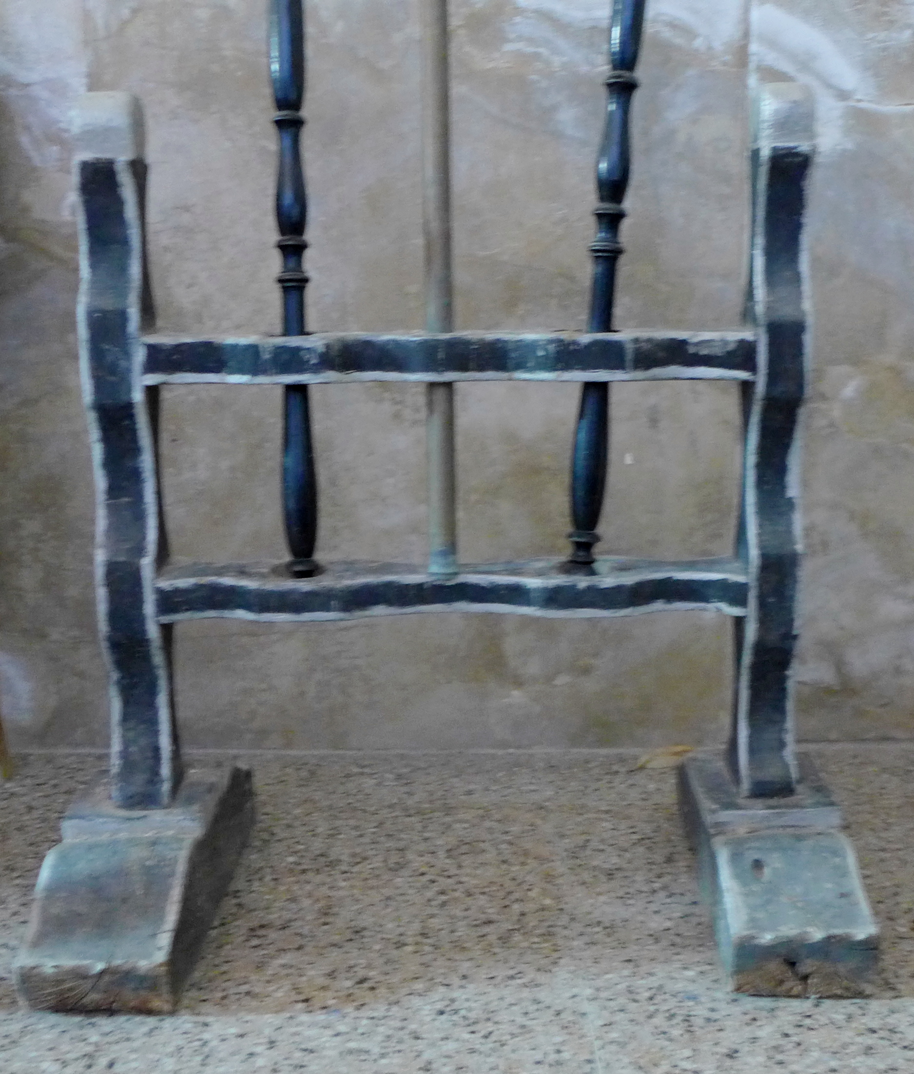 Simple estructura compuesta de dos zapatas de madera ensambladas a dos montantes de perfil mixtilíneo. El tablero superior se perfora con tres agujeros para colocar otras tantas hachas.