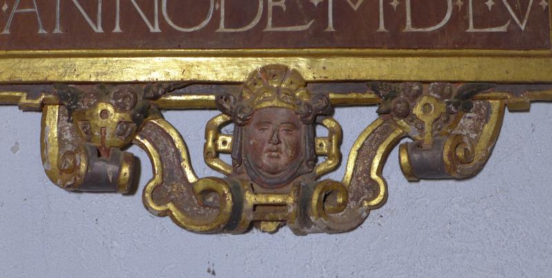 La decoración se concentra en los listones superior e inferior, con mascarones (el superior masculino, el inferior, femenino) con exóticos tocados, sostenidos por volutas en forma de cueros recortados. Los listones horizontales se adornan con estilizados aletones.