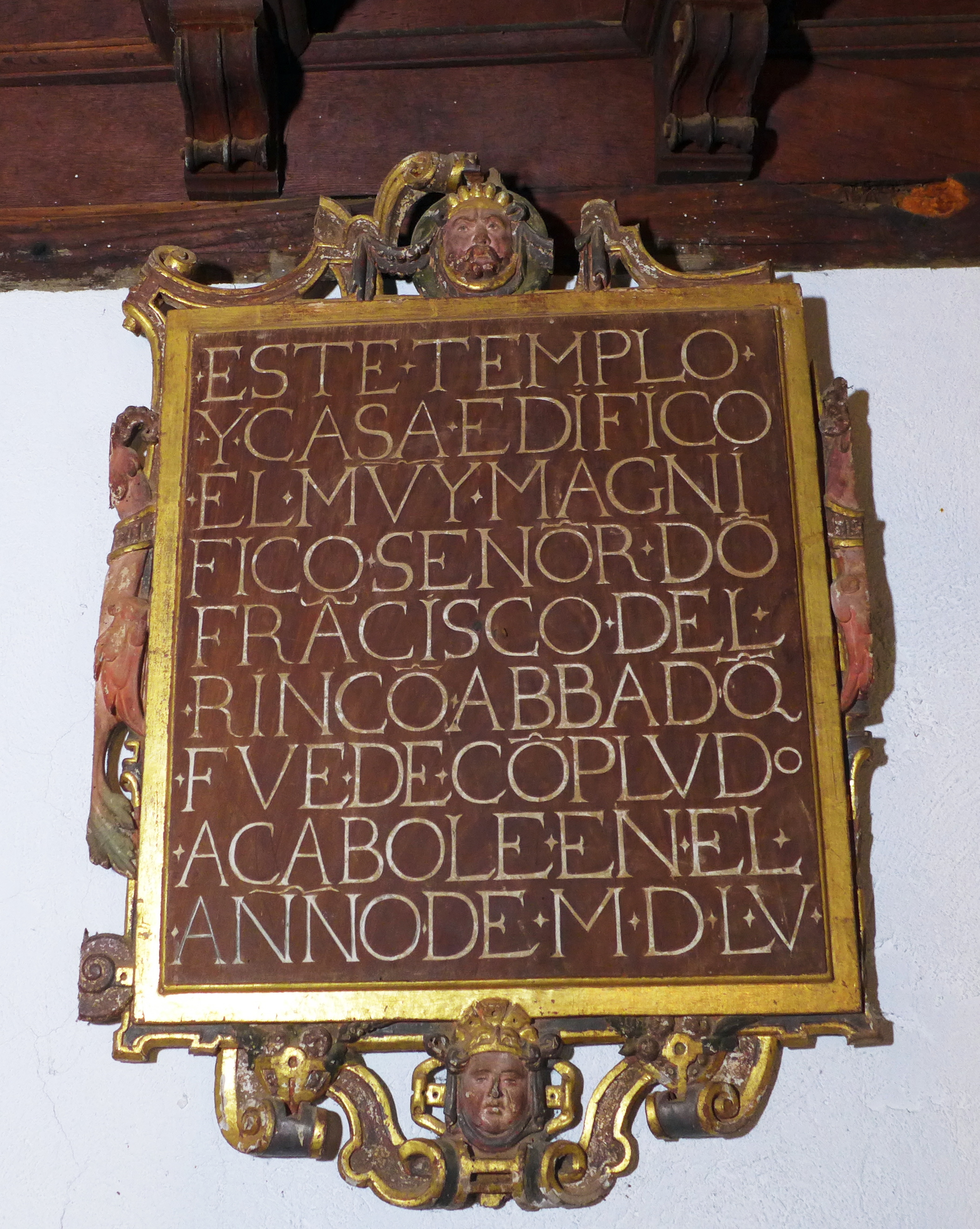 "ESTE TEMPLO / Y CASA EDIFICO / EL MVY MAGNI / FICO SENNOR DON / FRANCISCO DEL / RINCON ABBAD QUE / FVE DE COMPLVDO / ACABOLE EN EL / ANNO DE MDLV