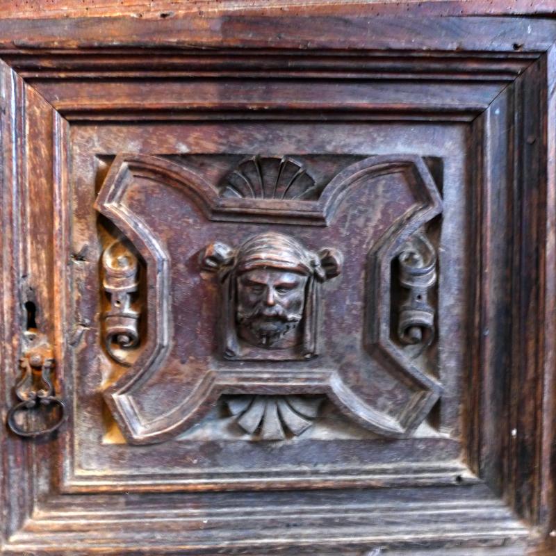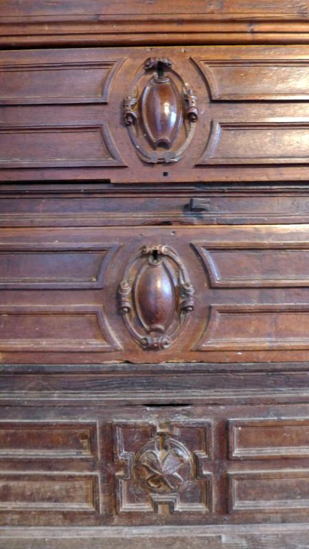 Los cajones grandes se adornan con molduras simples, con el mismo diseño los dos superiores y distinto el inferior. Los rectangulares exhiben una cabecilla entre molduras más elaboradas.