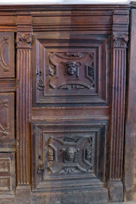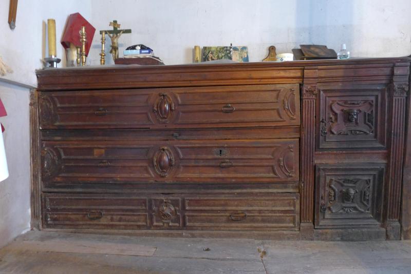 Mueble apoyado en el muro norte de la sacristía que sirve para guardar ornamentos y vestiduras litúrgicas. Se compone de tres cuerpos, el más ancho (a la izquierda, según se mira frontalmente) formado por tres grandes cajones, con dos tiradores de forja cada uno; el central, entre pilastrillas estriadas, con dos cajones rectangulares, para conservar otro tipo de elementos, no textiles. Es el más decorado. Completa el conjunto otro cuerpo formado por un cajón rectangular superior de apertura frontal y dos puertas de apertura lateral en su parte baja, que ocupa el lugar de los dos cajones inferiores del primer cuerpo.